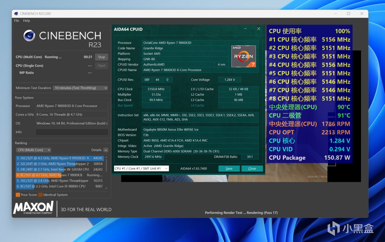 銳龍7 9800X3D開啓PBO ENABLE檔,使用阿薩辛4S壓制跑CINBENCH R23多核十分鐘,最終CPU二極管最高溫度爲91℃,可以完美髮揮性能~
