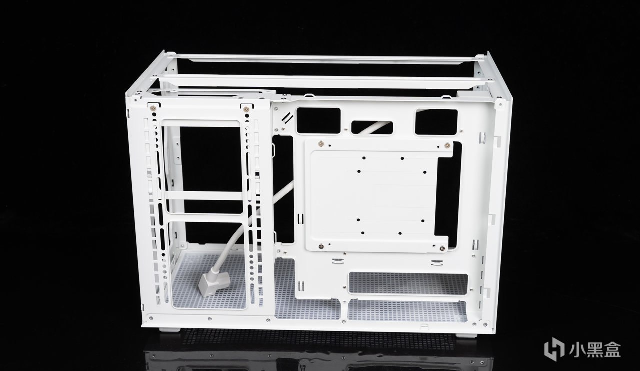 背面留有較深的背線空間,從開孔大小和佈局來看,就知道它是一款支持MATX背插的機箱,不過硬盤位支持略有保守,只兼容1*2.5 SSD或者1*HDD。