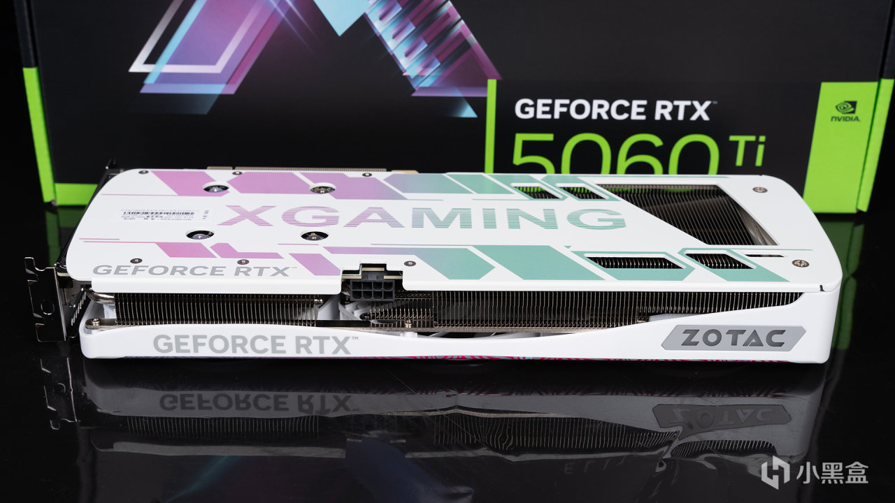 側面角度能看到RTX 5060 Ti XGAMING OC 8GB的厚度是比較薄的——45mm屬於標準2槽,左側是GEFORCE RTX LOGO,右側則是支持ARGB燈光的ZOTAC LOGO,考慮到燈光區域設計相當簡潔,作爲無光顯卡也是不錯的選擇。