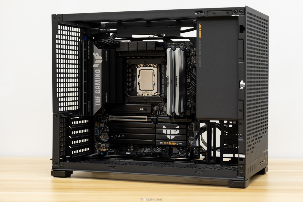 接下來把準備好的主板放進去,然後就是瘋狂的接線時光,音頻線USB以及跳線一個都不能少。主板裝上去之後機箱也是初具人形(bushi),下面就可以裝顯卡。D32 pro之所以能支持長顯卡,原因之一就是顯卡安裝沒有遮擋,機箱擋板前面那一塊是可以拆卸的,拆下來就可以毫無遮擋地把顯卡插進去,我覺得是一個很不錯的設計