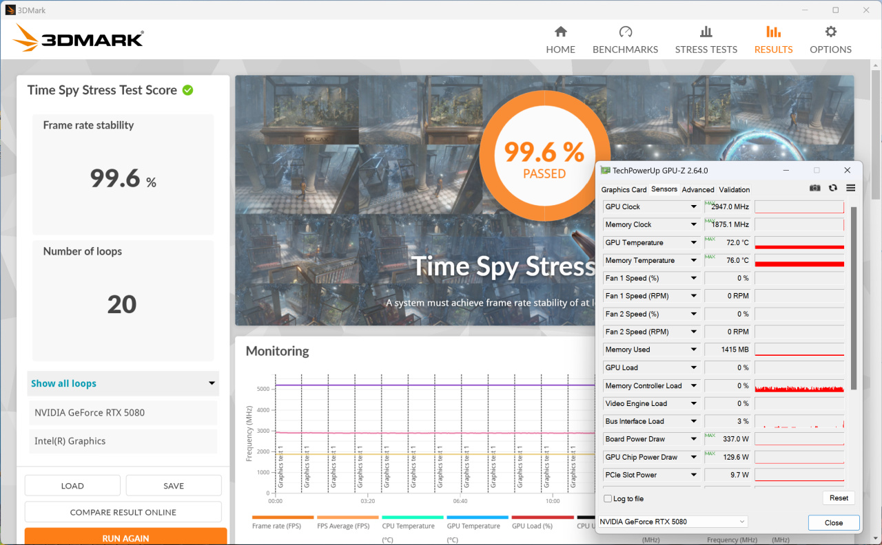 然後是烤雞測試,CPU烤雞溫度在90度左右,因爲我打開了華碩的boost優化,所以頻率一直在5G以上,功耗260W,被利民這個旗艦風冷輕鬆壓下來。而顯卡則輕鬆通過了3dmark的烤雞測試,通過率達到了99.6%,長時間運行下頻率基本不會發生變化,散熱規模收益可見一斑
