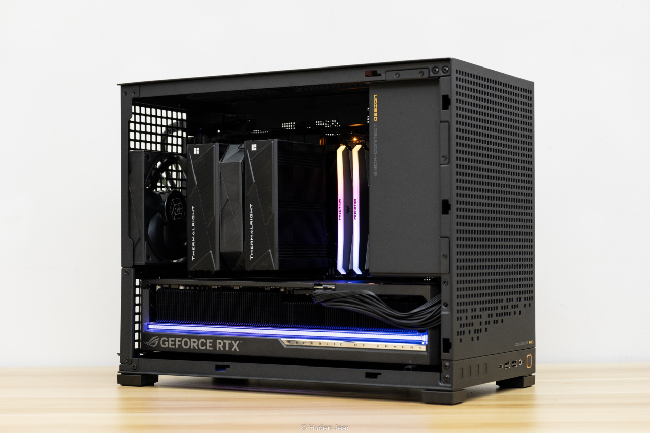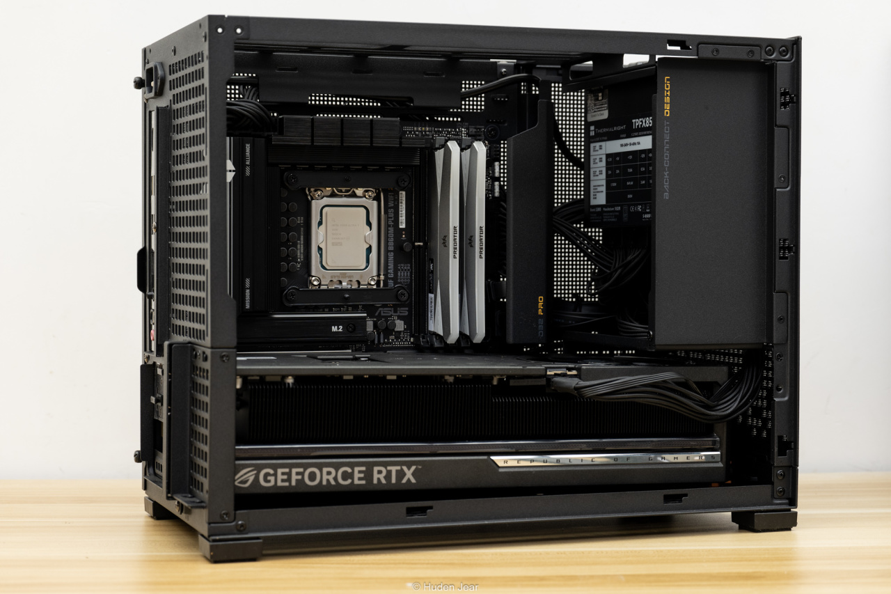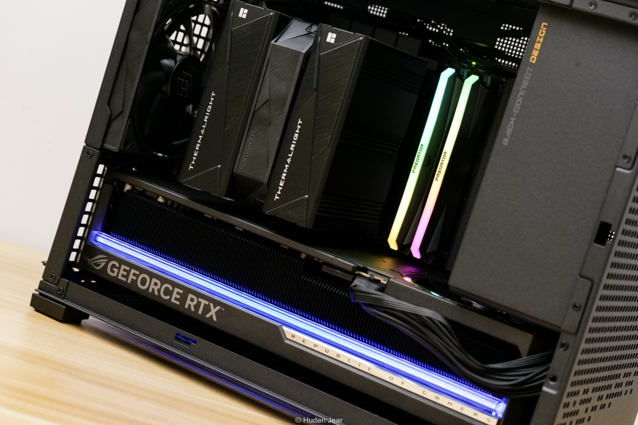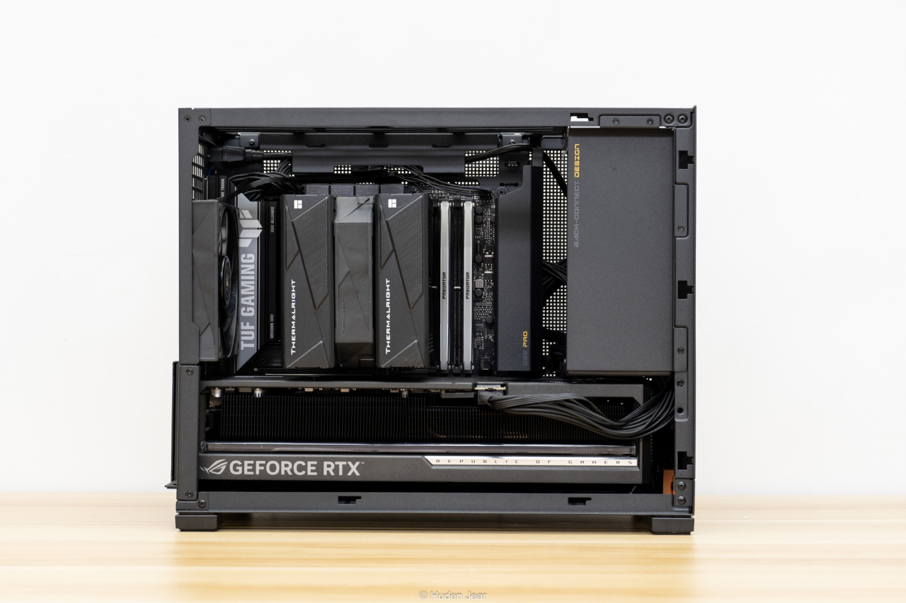 裝好顯卡之後大家應該就明白我爲什麼要用SFX電源了,這個機箱雖然支持長電源+長顯卡,但是RTX5080夜神前端這個區域如果沒有散熱空間就很難發揮出第四個風扇的實力,所以爲了散熱我在這裏保留了空間給顯卡留出風道