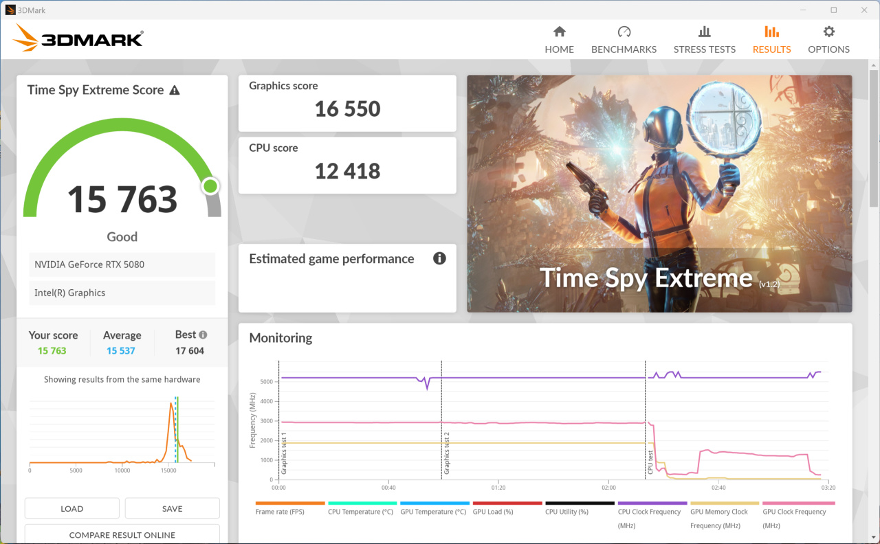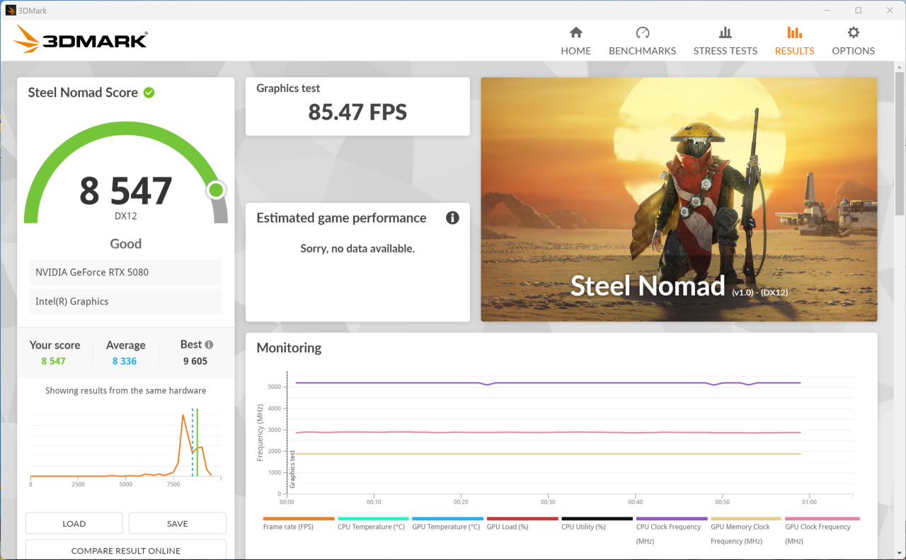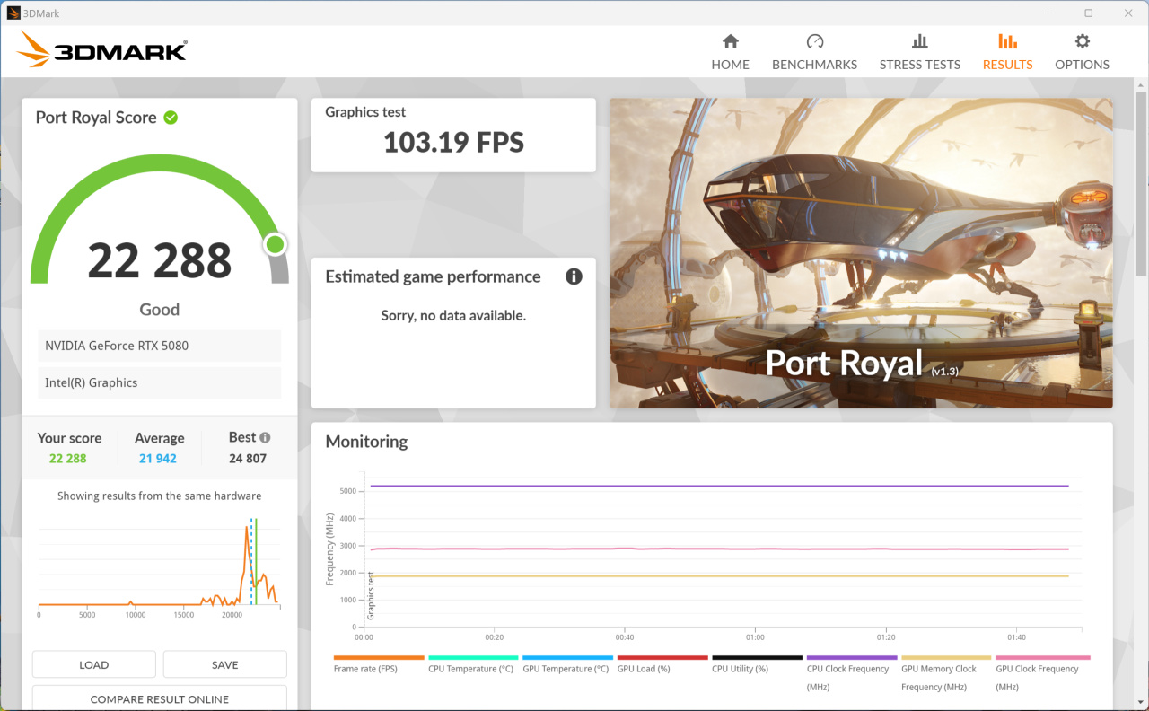 而3DMark的測試顯示出RTX5080在性能上的統治力,不管是傳統的DX12性能還是光追的Port royal沒有一個分數低的,有了這個遊戲性能玩什麼都會非常流暢,而且顯存也足夠支撐起4K的遊戲。