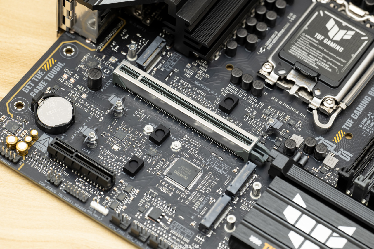 主板的IO區域比較豐富,除了顯示的HDMI和DP,還提供了7個USB-A和一個高速Type-C,以及最新的便捷wifi天線接口。TUF B860M PLUS WIFI已經支持了WIFI7,使用的網卡是是7925.主板還支持三個m.2硬盤插槽,擴展很豐富,也是Ultra系列的特點之一
