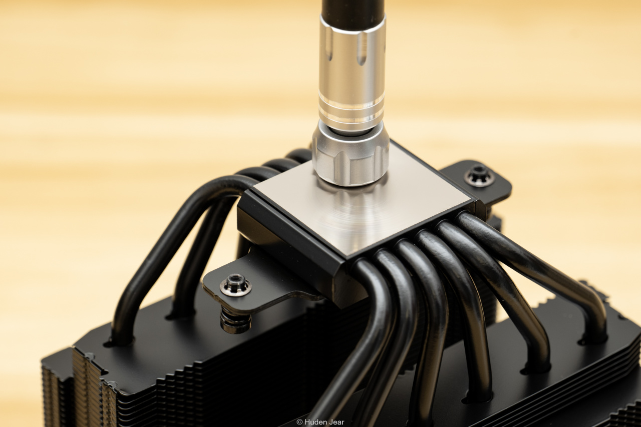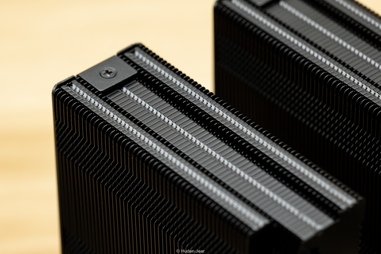 風扇塔體是全身黑化很帥,130mm寬度,保留了很不錯的兼容性的同時兼顧了散熱性能,這兩個風扇從參數來說都是非常優秀的,而且是動平衡軸。我親眼目睹主機關機之後這個風扇還持續轉了1分鐘,軸承真的不錯。主體的做工也很細緻,頂部有裝飾板蓋住熱管頭,兩側扣fin非常細緻,底部的銑削工藝是利民一貫的微凸