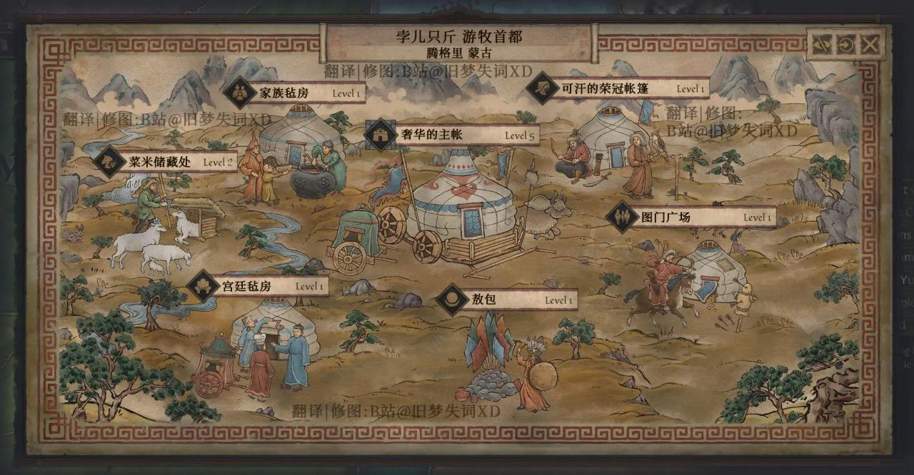 此外,我們還製作了很多以草原爲主題的事件圖,包括但不限於敖包、晝/夜營地、遊牧帳篷內部、哈拉和林、狩獵場景、御座廳、東方的村莊(及其燃燒版)、多種草原地貌變體等等。