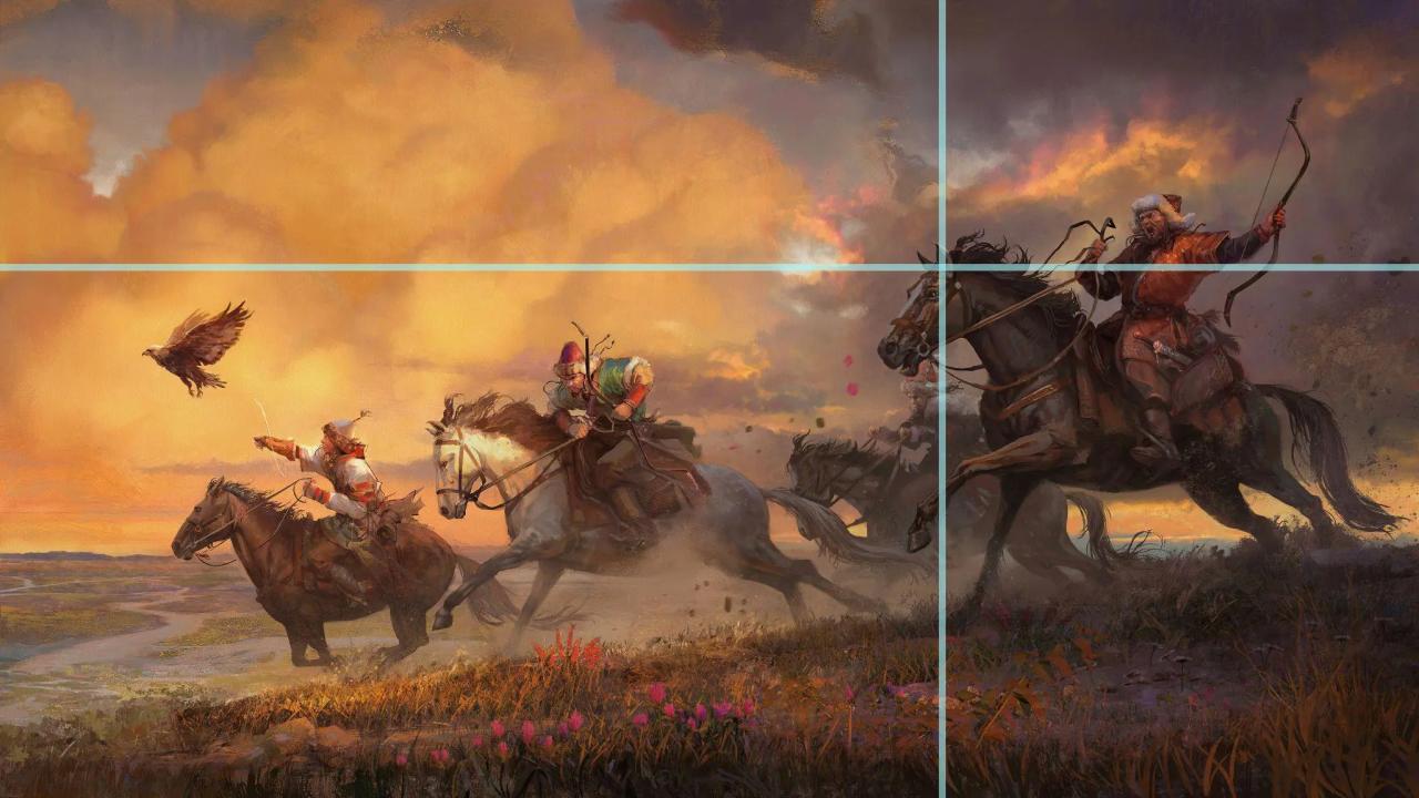 而按照三等分原則劃分,最前方的馬頭剛好就在視覺中心點上,使之成爲主視覺點。同時巧妙的改變背景顏色,通過明暗、色相和純度對比來加強作品左側的視覺感受,使畫面整體平衡與和諧。