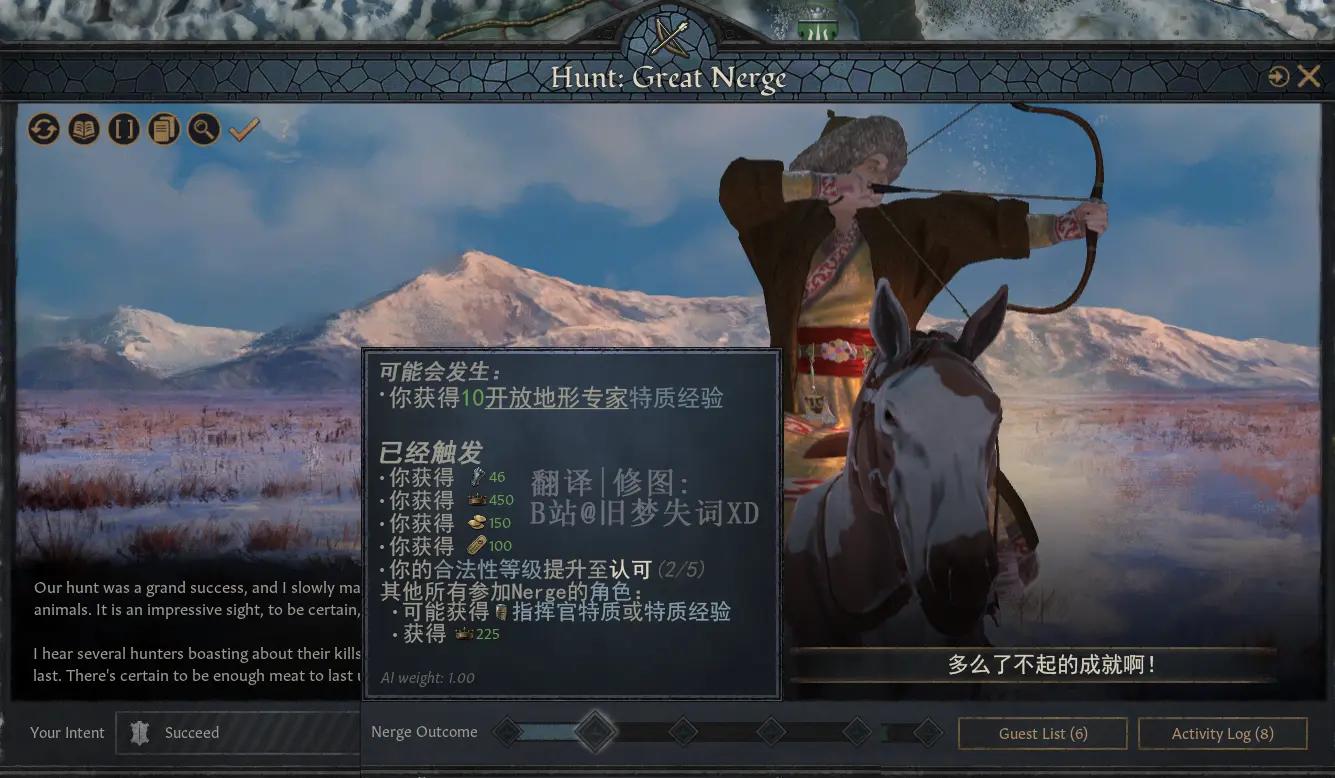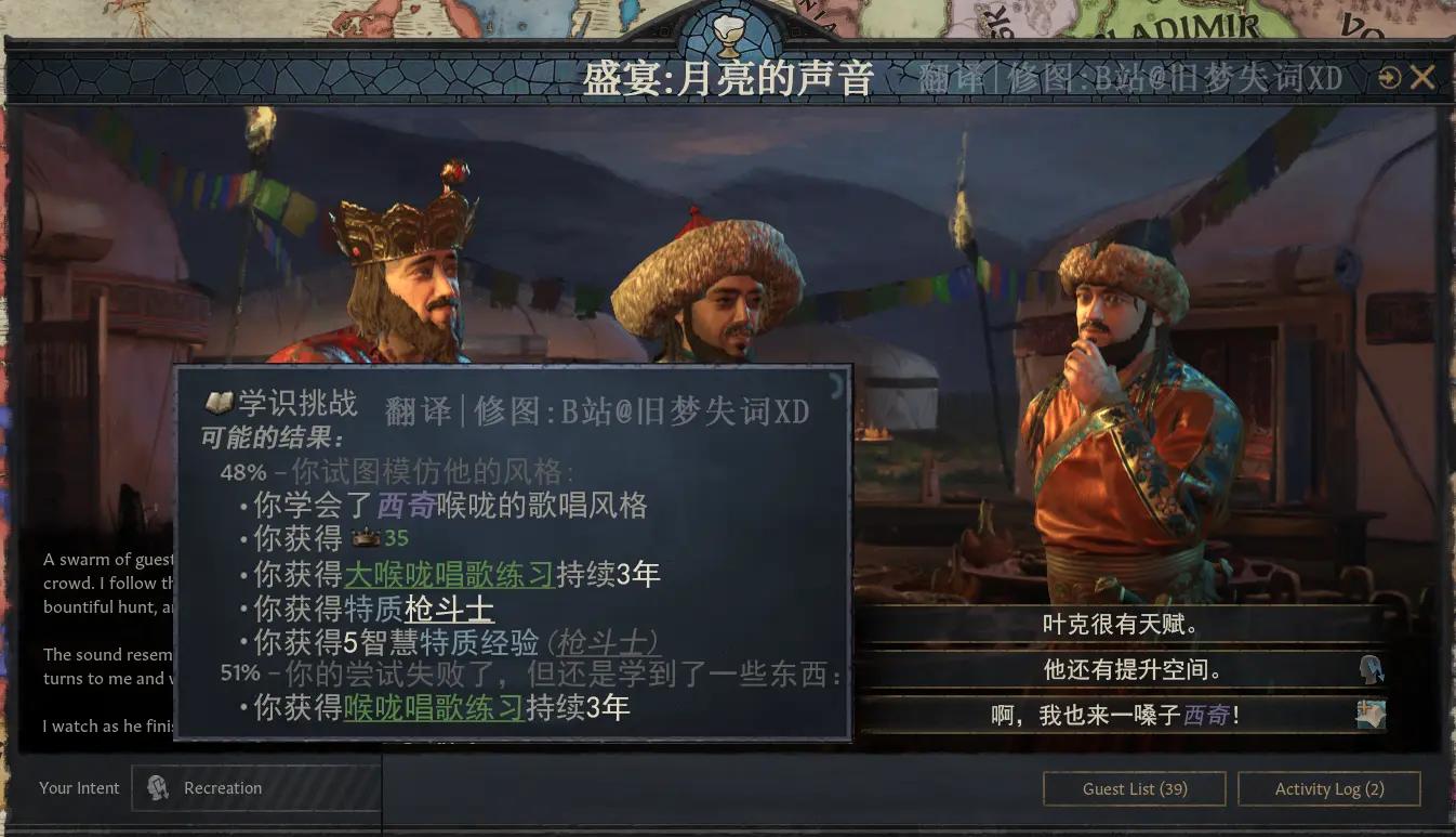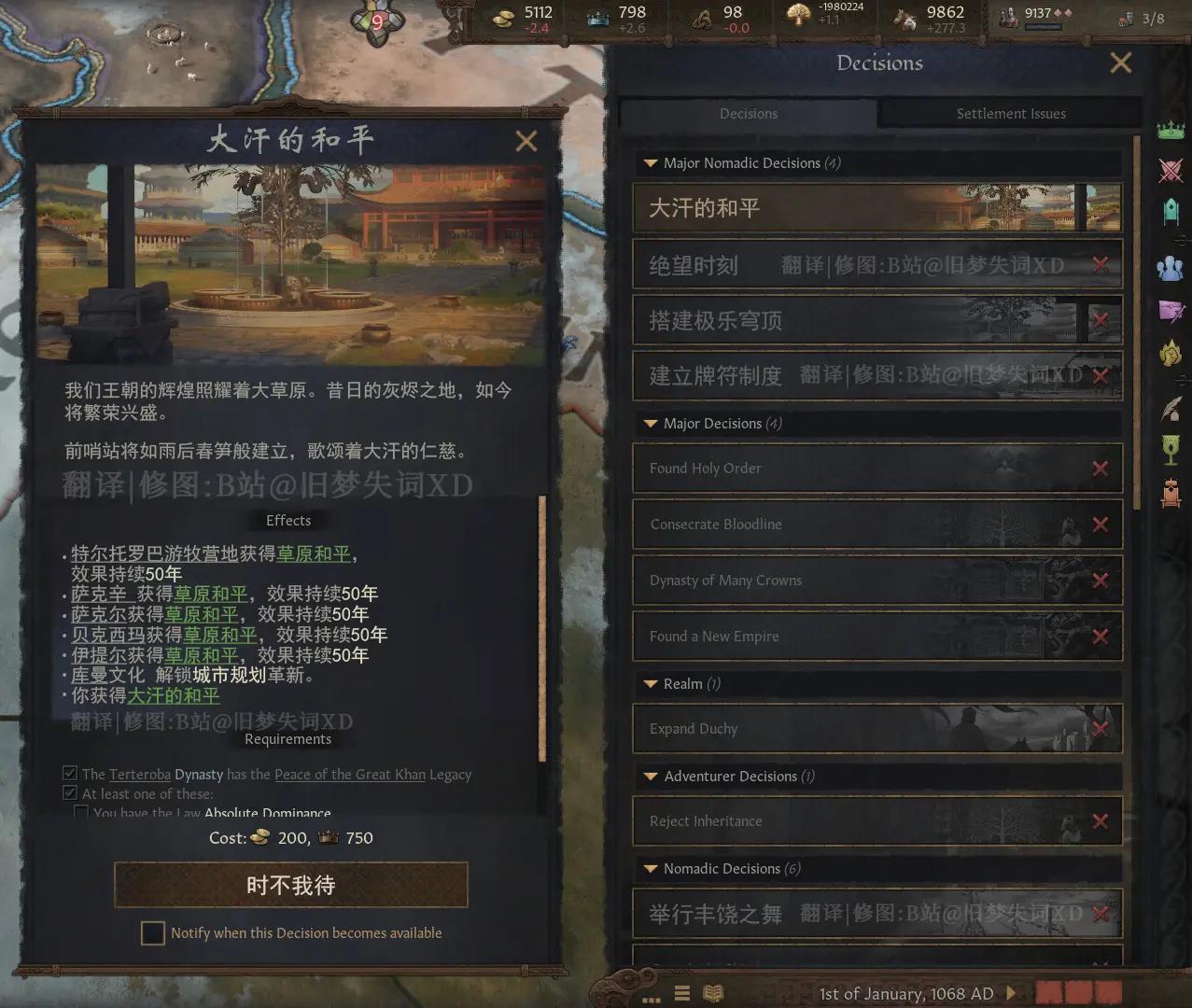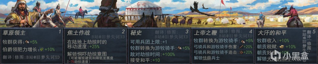 這裏可以看到點到第四級遊牧宗族傳承就能解鎖怯薛。此外,恫嚇劫掠意圖需要點出2級遊牧傳承。最後的大汗的和平就是給領地一個50年的大汗和平增益buff。