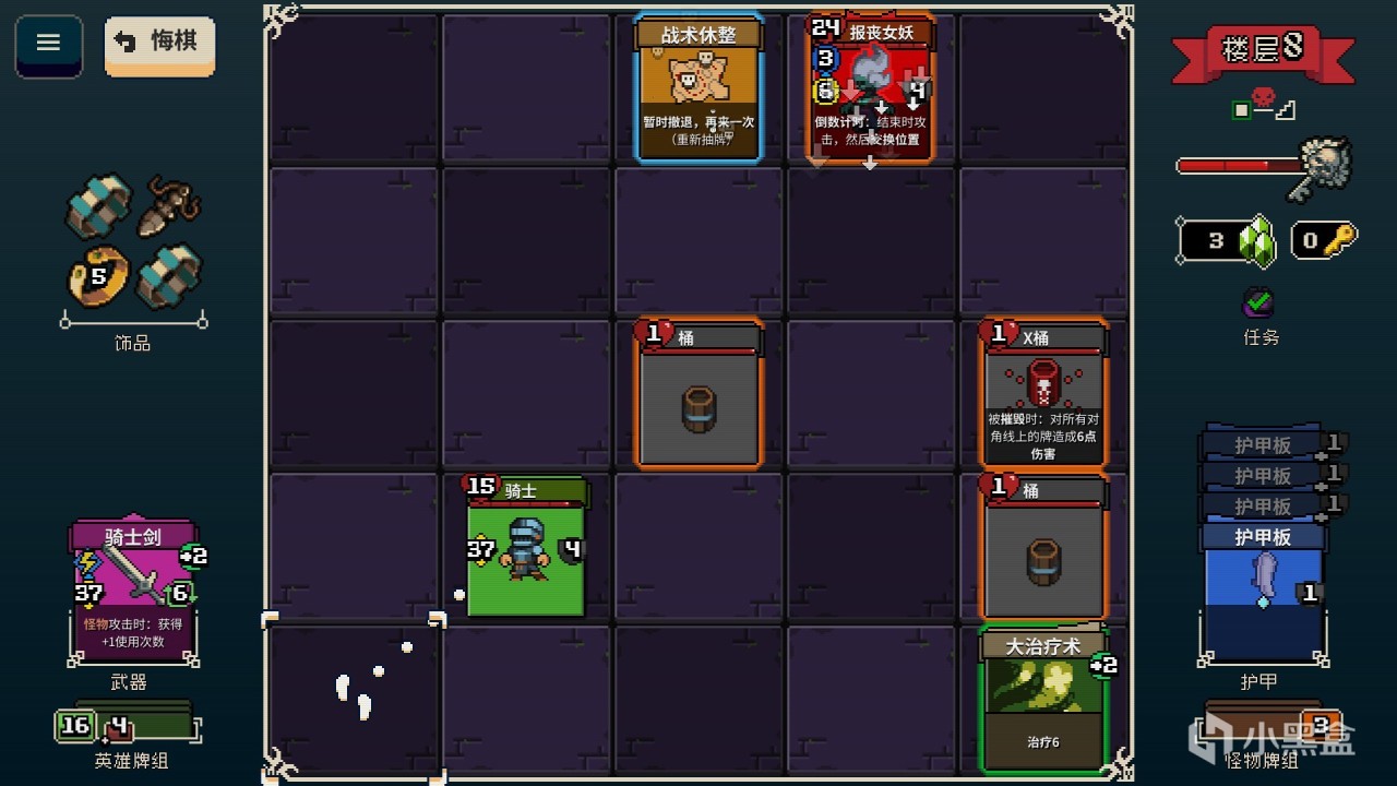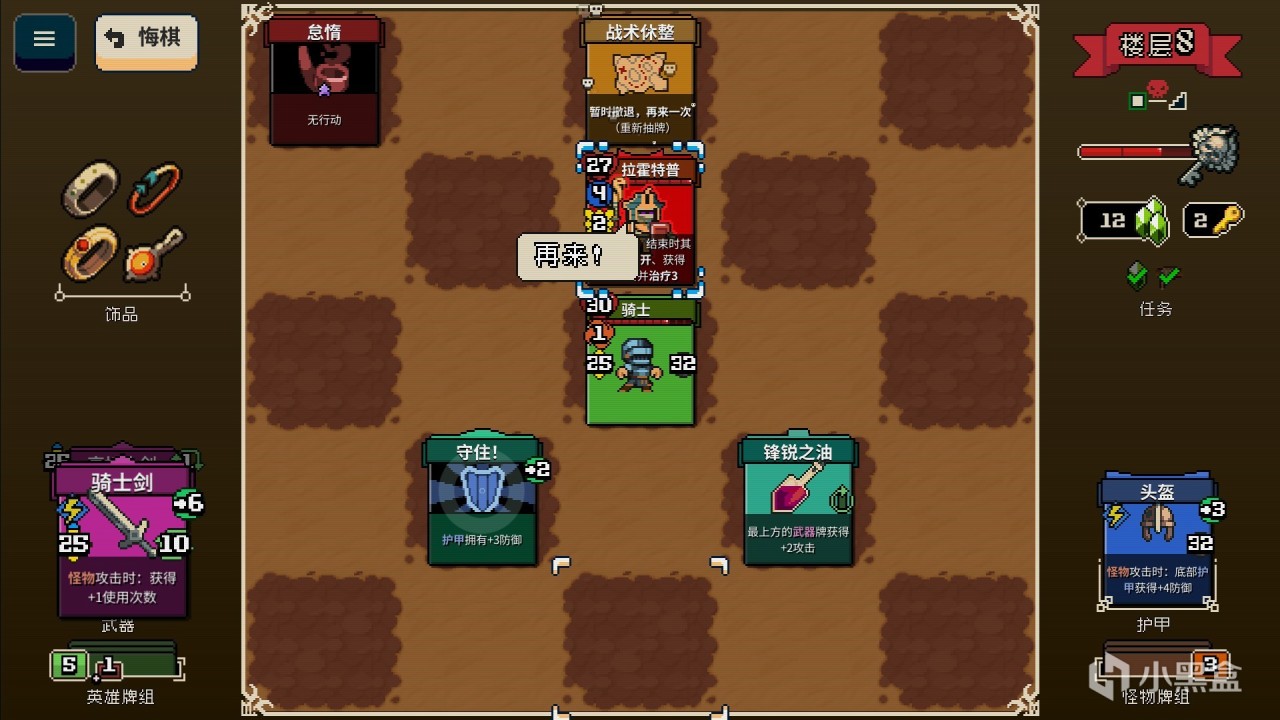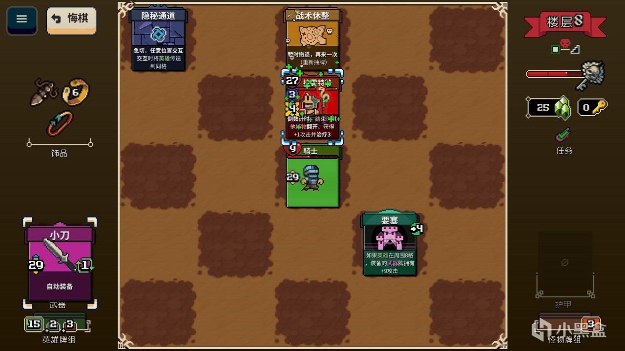 戰鬥:在卡牌控制在9以外的時後,大家進入下一回合後可優先點擊左下方怕牌組觀看騎士劍是否在場上,若是沒有悔棋進入另外一個房間。