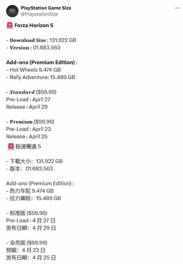 知名游戏博主@PlaystationSize今日透露,PS5版本游戏本体容量为131.922GB!其他两大DLC“风火轮”与“拉力冒险”的容量分别为9.474GB和15.489GB!