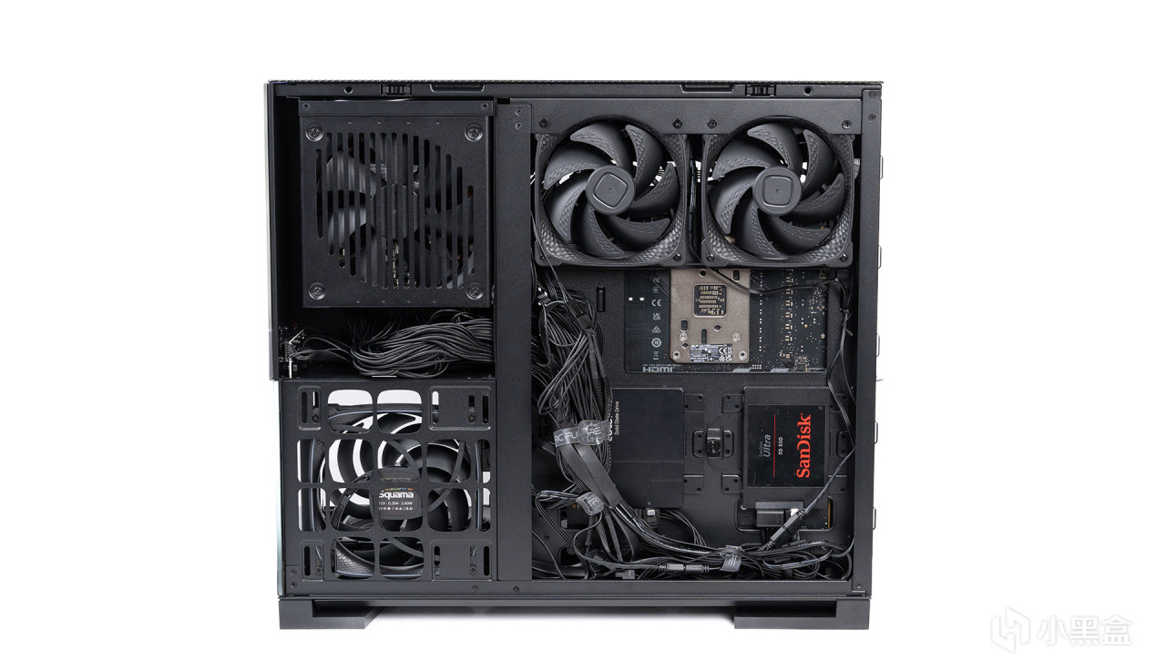 正面和側面鋼化玻璃均是快拆設計,這款機箱能在頂部、尾部、右側前部、主板背部和底部安裝散熱方案,並且除了主板背部都是支持140mm尺寸,這就意味着內部硬件可以盡享更大的風量,而主板背部散熱是一個海景房極其罕見又精妙的設計。