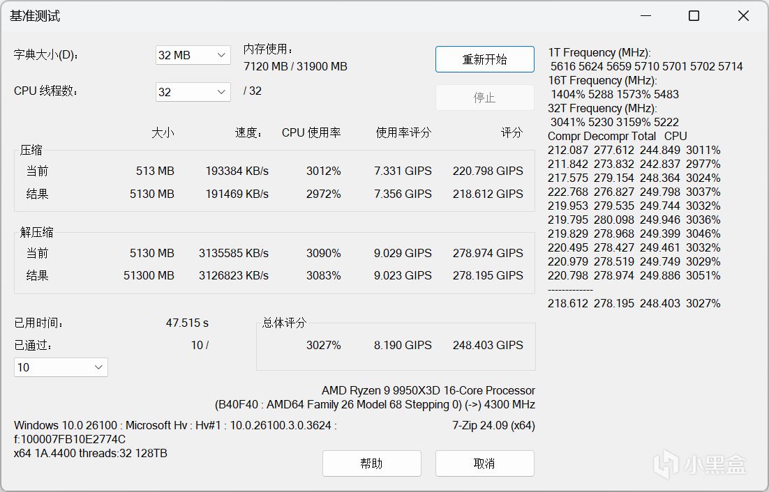 7-ZIP基準測試,9950X3D搭配DDR5 6400C32內存壓縮性能可達到191469 KB/s,繼續提升可挖掘內存性能,解壓縮更是直接來到了3126823 KB/s,這項對於AMD這種純大核規格同樣利好,繼續超頻後還會有進一步提升。