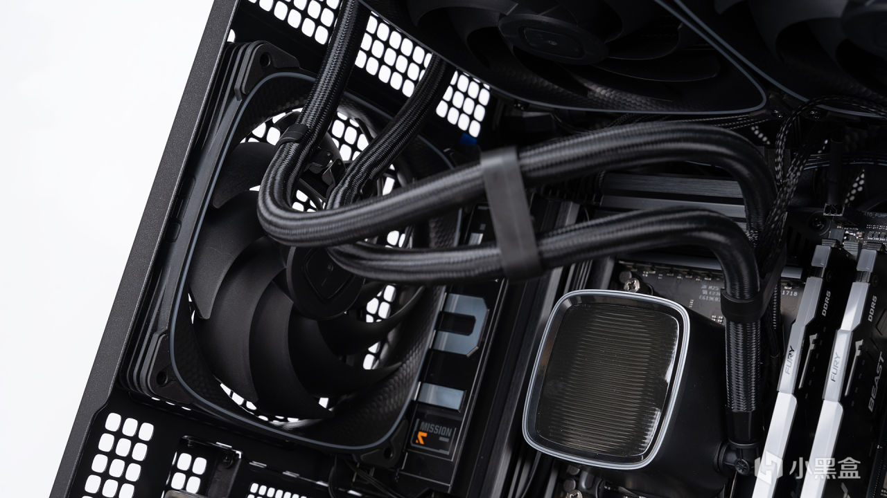 機箱頂部安裝了幾何未來愛斯基摩Pro 420,420冷排剛好一點不差塞進Model5裏,市面上能支持420mm冷排、顏值高風道又強勁的機箱還真數不出有幾款~