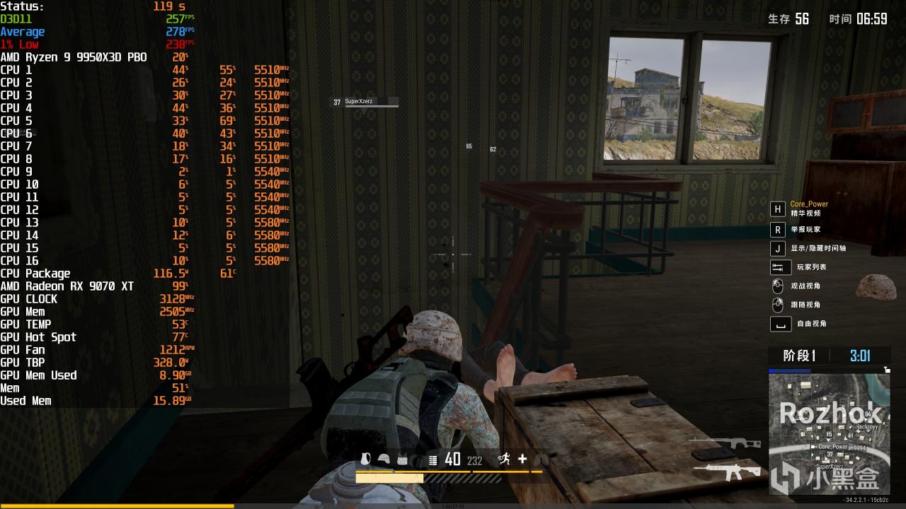 9950X3D+RX 9070 XT運行4K《絕地求生》自定義三超高畫質,平均幀數爲278fps,1% LOW幀爲238fps