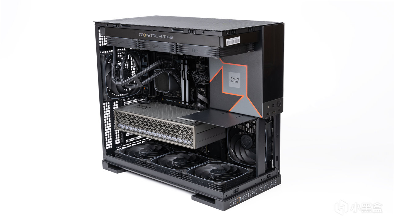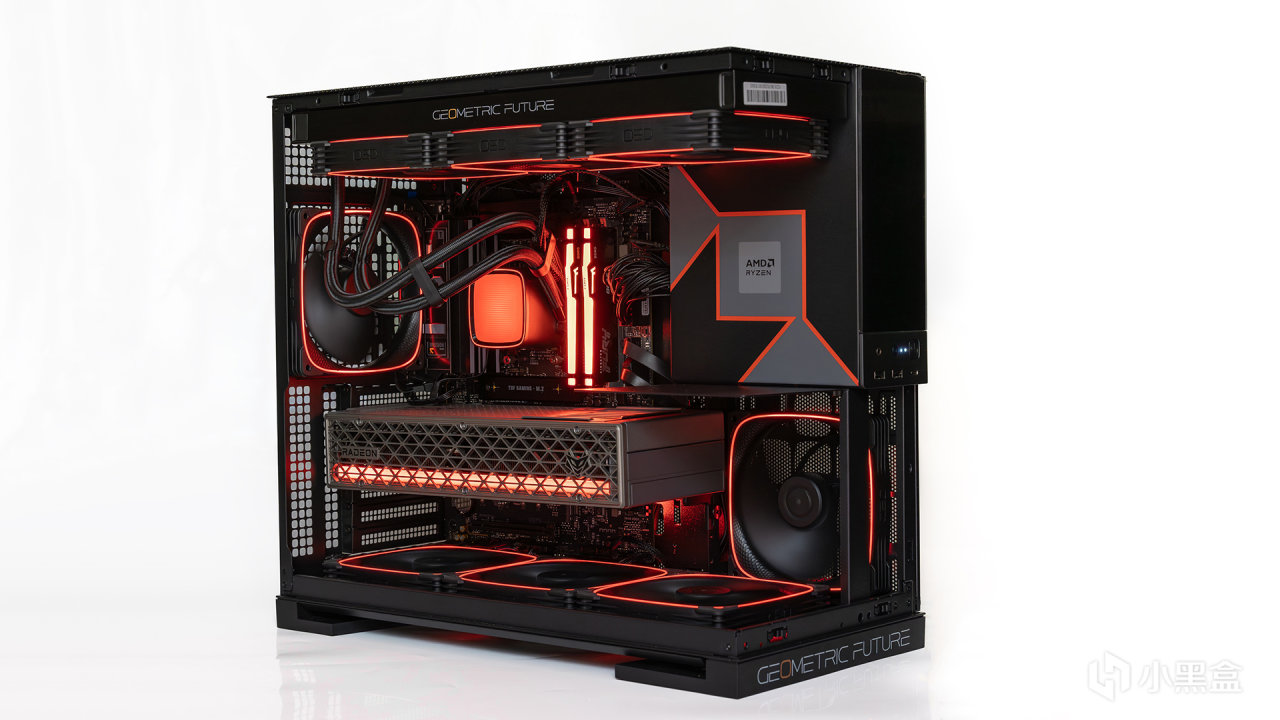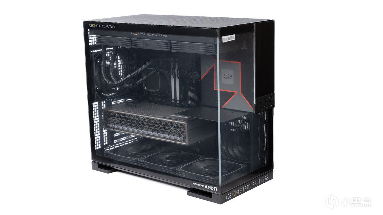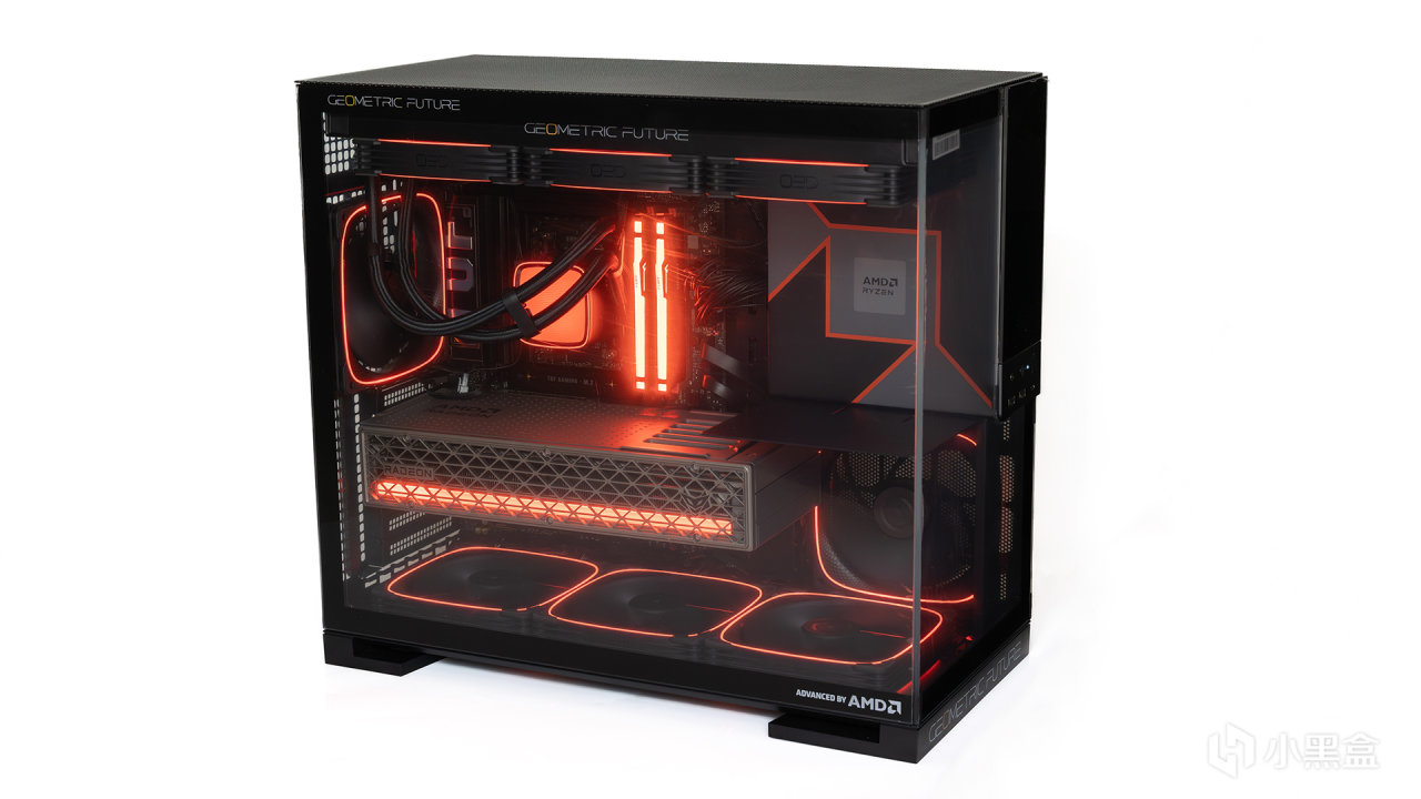 這次整機的機箱就是基於幾何未來Model5打造的AMD信仰版,正面和側面都是鋼化玻璃,和其他大多主流海景房機箱不一樣的是,它採用了前置電源設計,並且在電源倉處設計了獨特的撞色主題和手辦平臺。下方有“ADVANCED BY AMD”的標語,強調AMD推動技術進步的品牌使命。