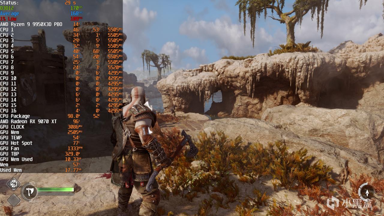 9950X3D+RX 9070 XT運行4K《戰神:諸神黃昏》預設超高畫質+FSR4質量檔+幀生成,平均幀數爲168fps,1% LOW幀爲109fps