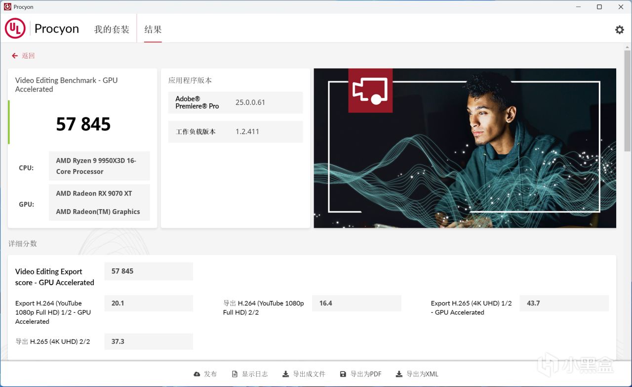 UL Procyon的視頻編輯基準測試,9950X3D最終得分爲57845,應用的程序是經典Adobe Premiere Pro,包括主流H.264/H.265編碼視頻導出測試,除了CPU性能以外還涉及一定程度的GPU引擎加速表現影響。