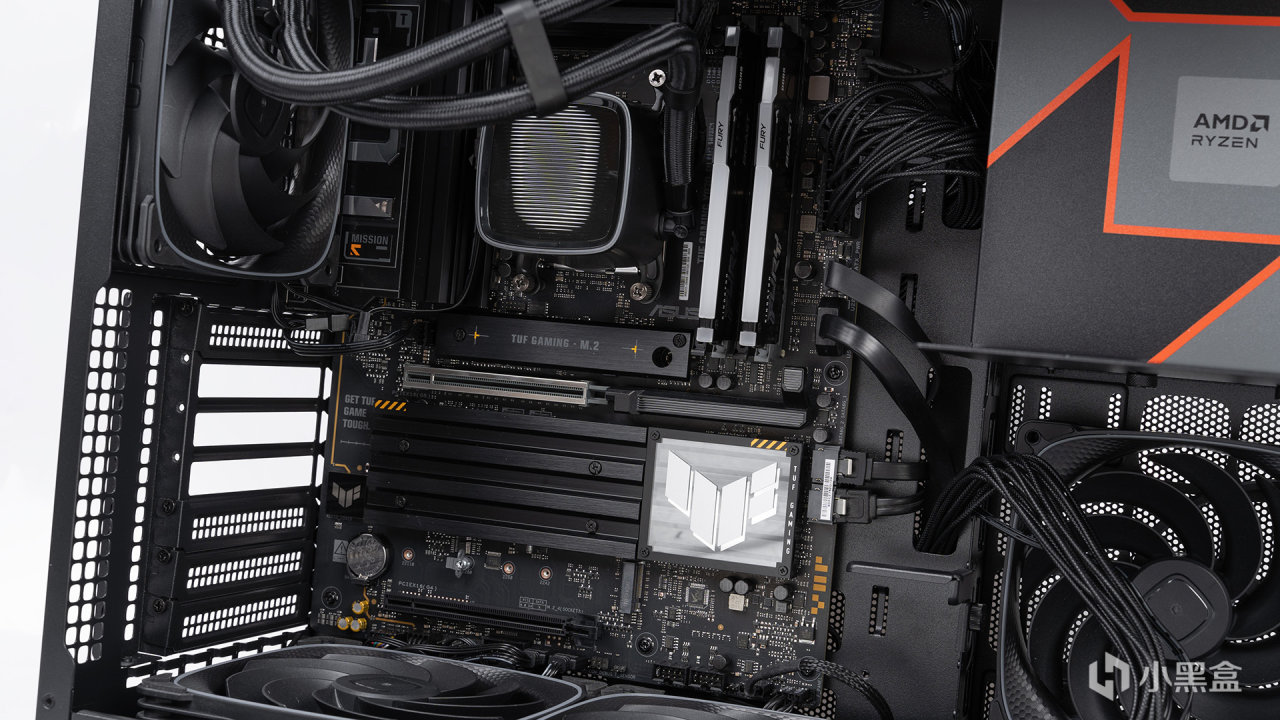 華碩TUF GAMING X870-PLUS WIFI,本身也是一款純黑主題的主板,加上TUF GAMING獨有的點綴黃色和金屬LOGO看起來和Model5也是絕搭。