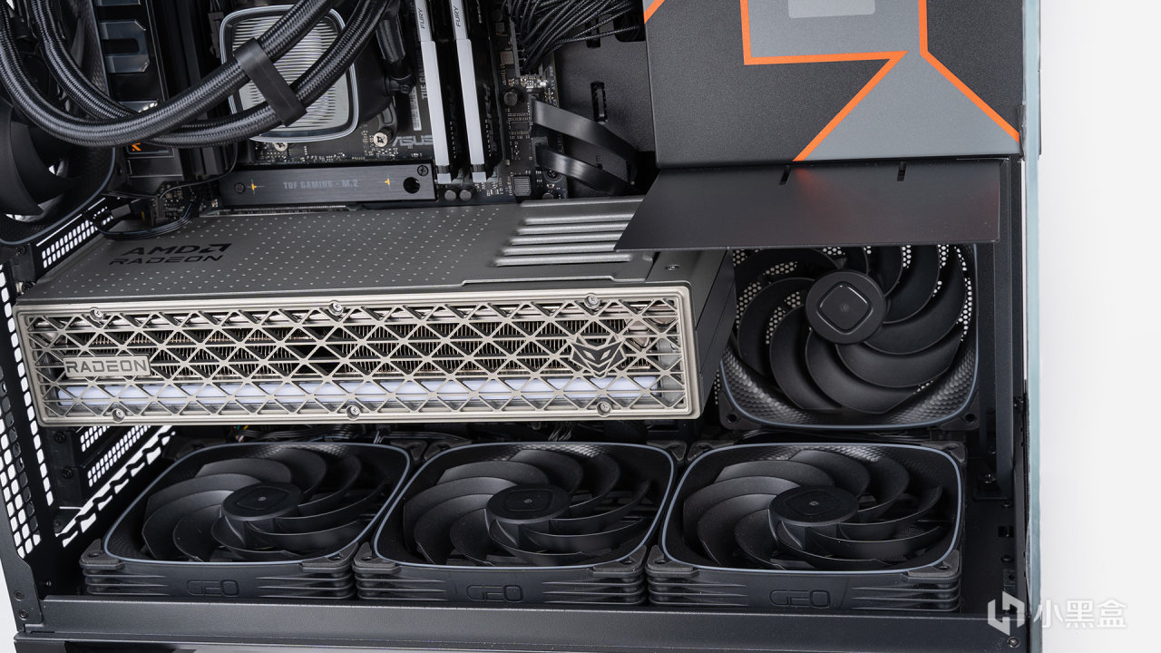 藍寶石RX 9070 XT NiTRIO+氮動OC顯卡,因爲是背插接口設計正面已經完全看不到任何線材阻擋,不過它整體是灰色和箱內的其他黑色硬件有一點不搭,不過往另外一方面想,這樣反倒更突出顯卡的存在了,實際通電使用中觀感通常也只有一致的燈效。