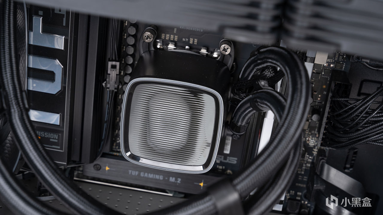 因爲這次要安裝尾部的140mm出風正葉風扇,一開始還有點擔心水冷管會不會打到扇葉上,事實證明因爲有導水管卡扣調整答案就是完美兼容,不過這樣水冷管這樣走法在平視時水冷頭會有所遮擋。