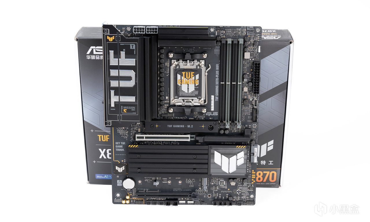 TUF GAMING X870-PLUS WIFI外觀設計,典型ATX板型打造,整體採用純黑主題結合條形紋理、TUF GAMING金屬LOGO以及點綴黃元素設計,質感相當不錯,屬於硬朗風格取向,確實適合黑色主題的裝機。