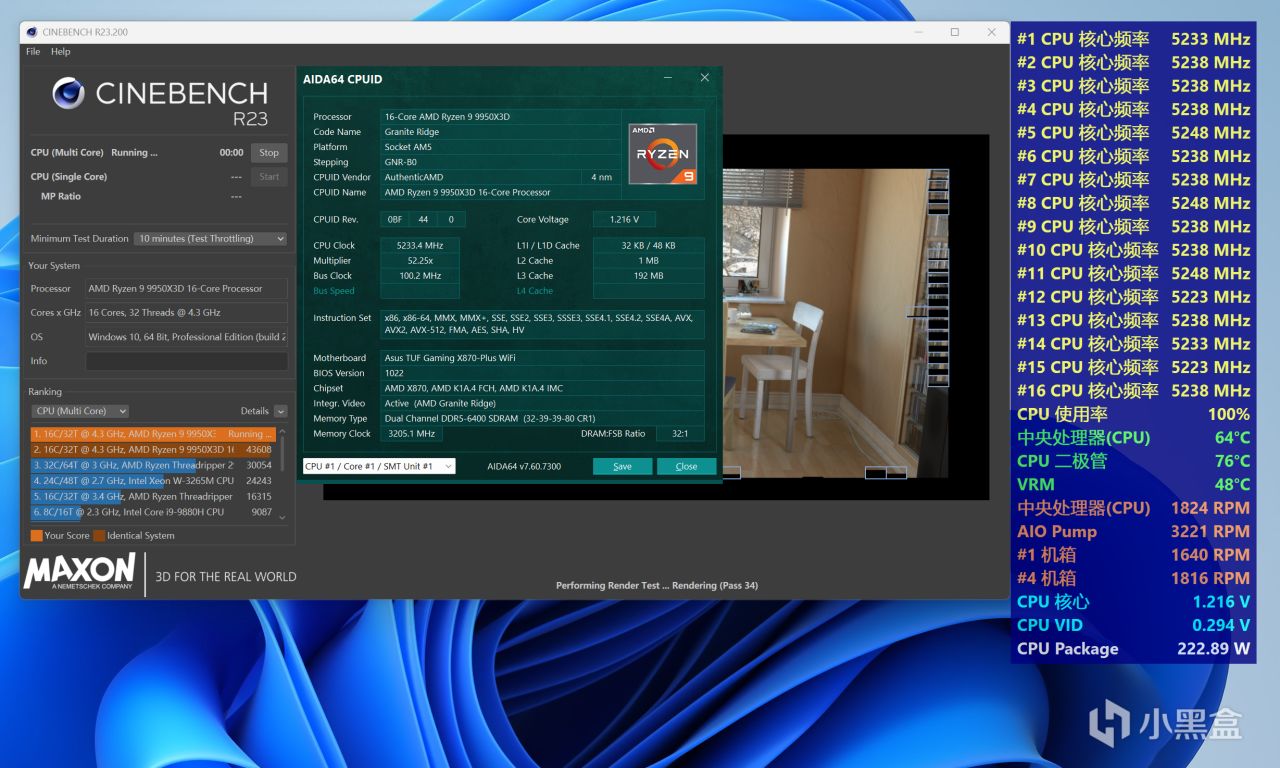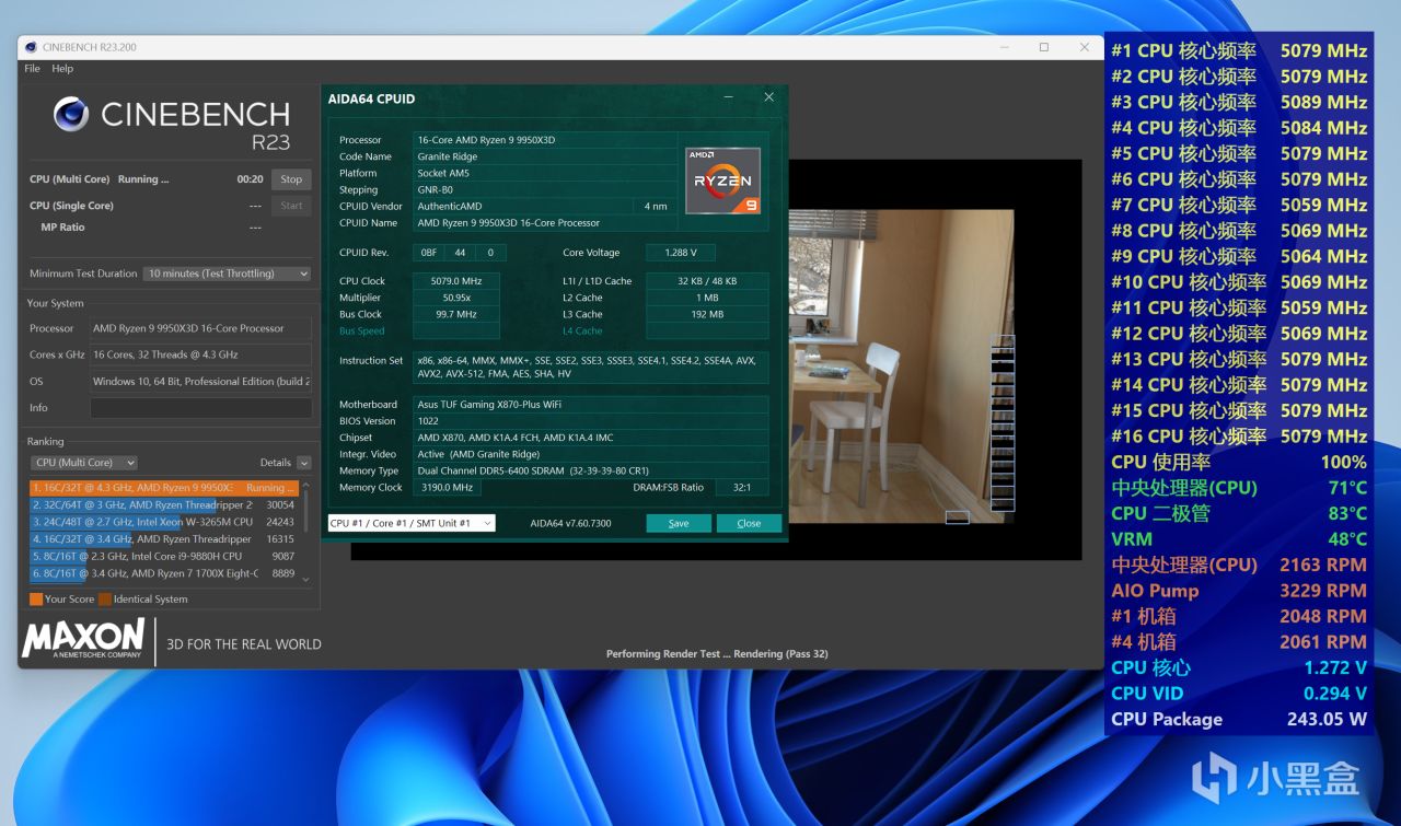 經過CINEBENHCH R23長達十分鐘的多核循環後,9950X3D最終得分爲43608 pts,和單輪測試差距不過3%屬於穩定的水平發揮,而單核得分則是2279 pts,屬於緊追Ultra 9 285K的超強表現了。