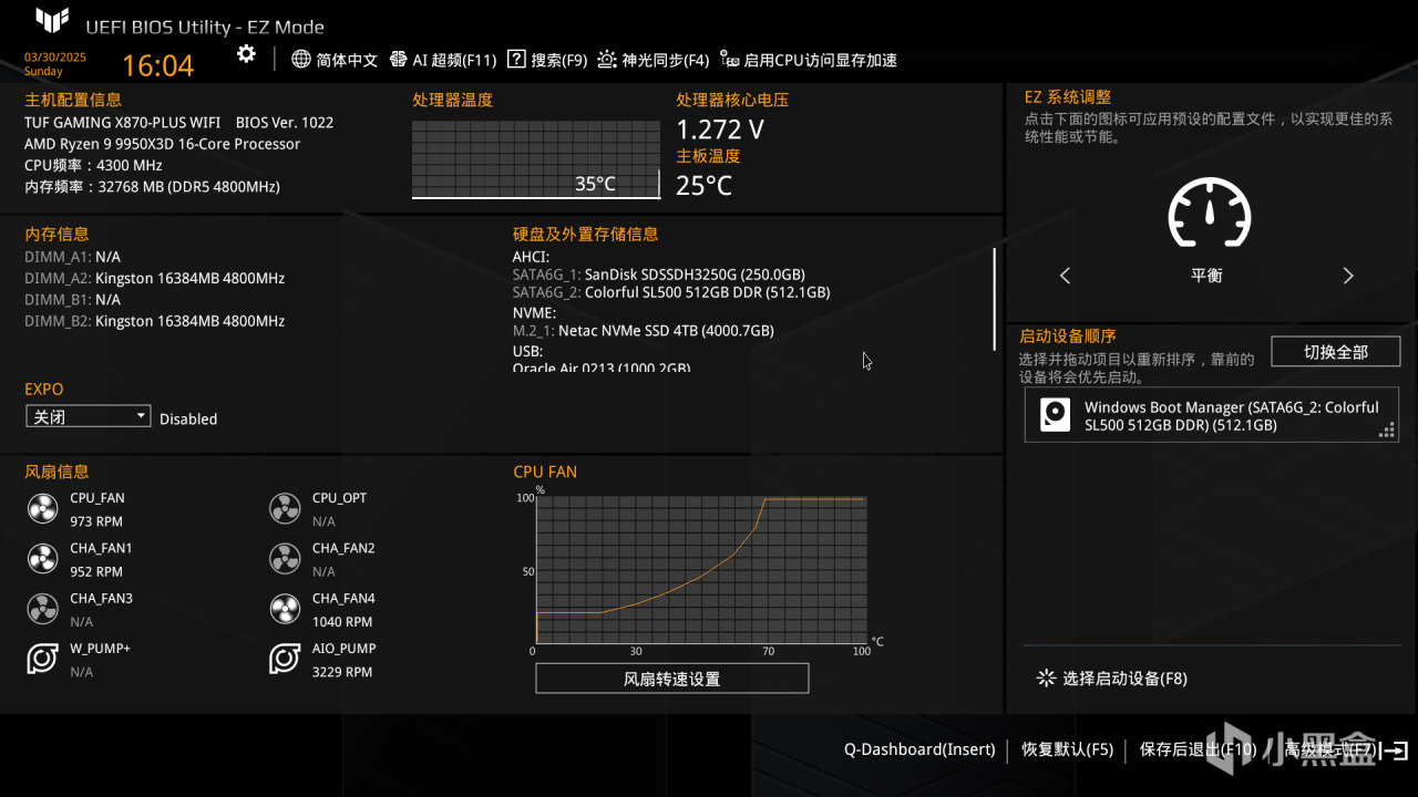 對於9950X3D切記得更新BIOS使用,TUF GAMING X870-PLUS WIFI最新的1022版本已涵蓋AGESA 1.2.0.3a微碼支持,配合最新芯片組驅動可完美髮揮雙CCD架構處理器的調度。進入BIOS之後是EZ模式,此界面已覆蓋大多數主流用戶所需功能,比如EXPO開關、風扇轉速設置、神光同步、Resizable BAR技術等。
