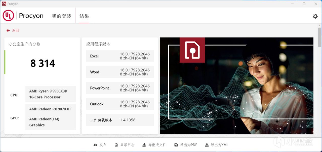 來自UL Procyon的Office Productivity基準測試,是針對微軟Word、Excel、PowerPoint和Outlook代表性辦公任務性能,9950X3D和9950X一樣擁有足夠高的單核睿頻,所以這個項目取得了8314的高分。
