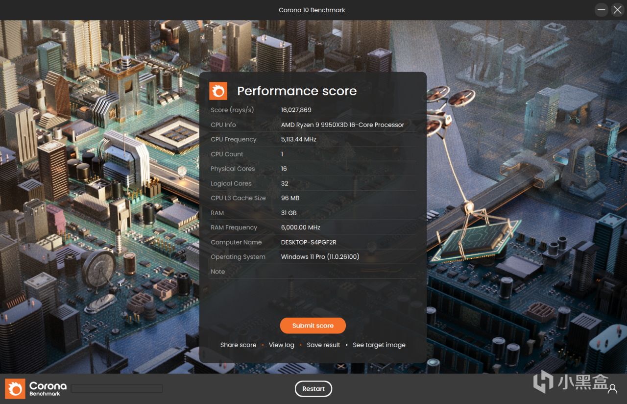 Corona 10基準測試,9950X3D最終得分16027869,16個純大核設計,性能也可以得以充分發揮,這個項目還關聯一定內存性能,願意折騰的玩家可以進一步優化時序。
