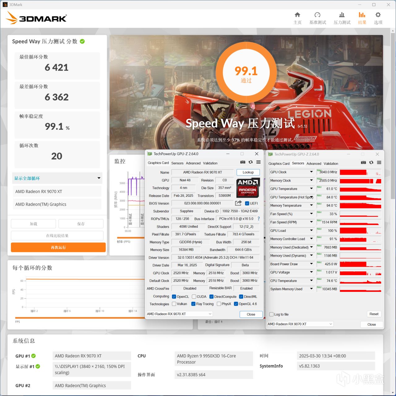 顯卡測試就通過光柵和光追混合的Speed Way項目進行,在封箱狀態和自動PWM調速情況下,藍寶石RX 9070 XT NiTRIO+氮動OC最終通過率可達到99.1%穩定度,最佳和最差循環差距不足1%,GPU核心最高溫度爲61℃,顯卡功耗最大跑到了425W,顯卡風扇最高轉速僅1500RPM運作安靜,機箱底部的進風風扇可見有很大的實際作用,不過顯存溫度略高,介意的話可以自行拉高顯卡風扇曲線。