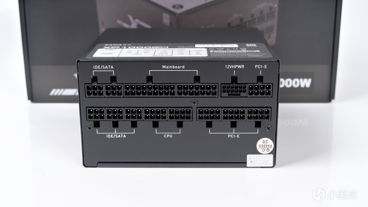 全模組接口設計,具有明顯的分區標識,包括兩組CPU接口、四組PCIE接口、兩組24pin主板供電接口、五組IDE/SATA接口以及一個原生、支持支持600W的PCIe 5.0 12VHPWR接口。