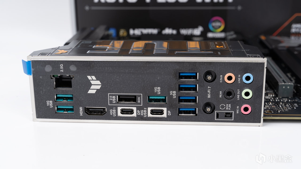 主板I/O接口一覽,從左到右分別是2.5G網口、3*USB 10Gbos Type-A、1*HDMI 2.1、1*USB 2.0、2*USB 4 40Gbps、4*USB 5Gbps Type-A、支持Wi-Fi 7的無線模塊、五組音頻接口以及BIOS FlashBack按鈕。