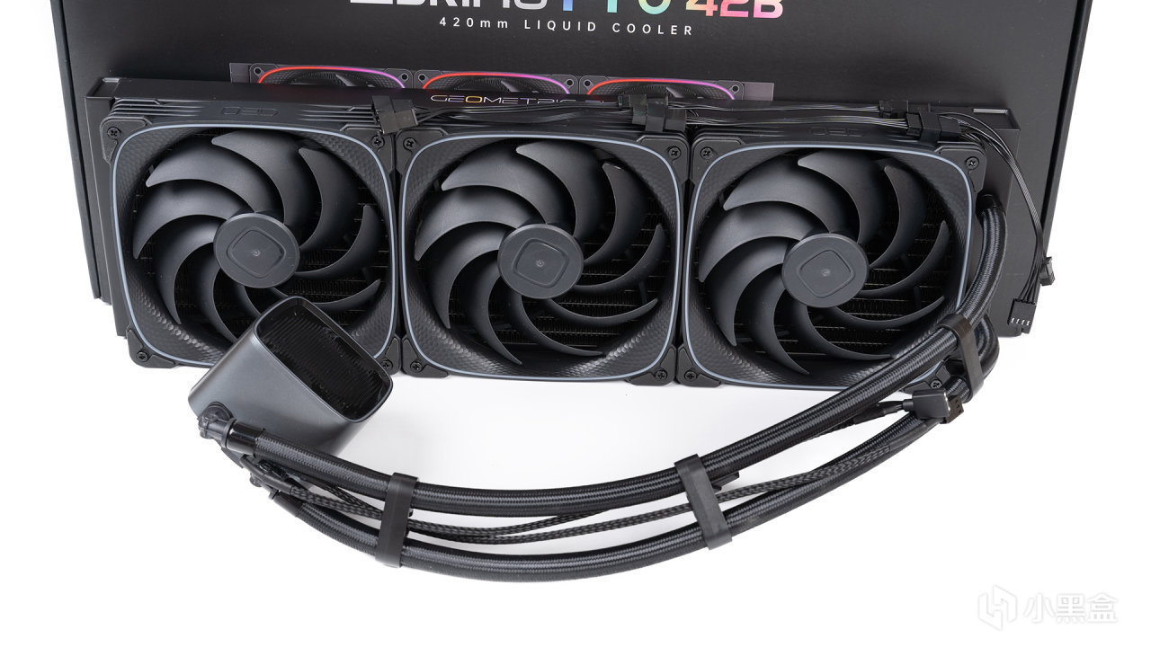 這次也選擇了幾何未來愛斯基摩Pro 420這款水冷散熱器,同價位AIO水冷大多數均爲360mm,它擁有420mm尺寸意味着更大的散熱面積散熱效能自然更強,尤其是AMD和Intel旗艦處理器有更明顯的壓制效果,水冷出廠已預裝冷排風扇,其尼龍編織網水管也並配備導水管卡扣。