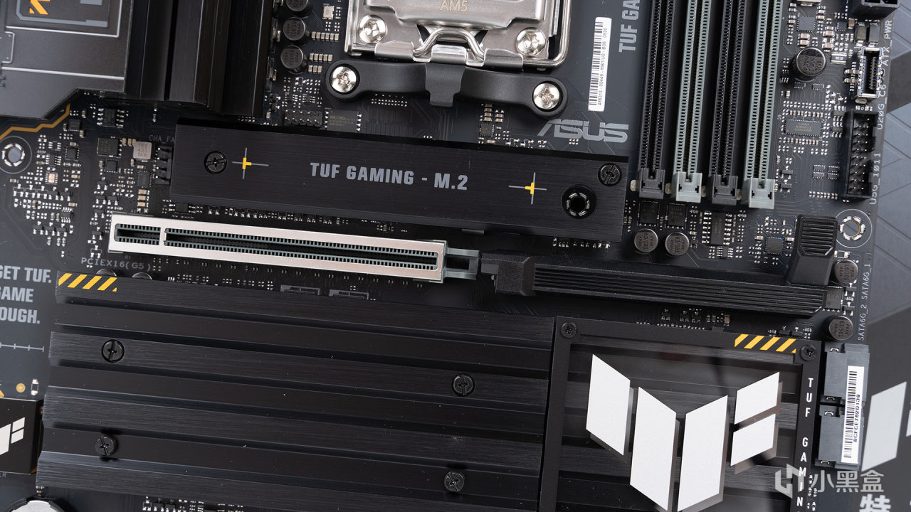 TUF GAMING X870-PLUS WIFI擁有四組M.2插槽,上方兩組支持到PCIe 5.0X4,除了最下方的都配備M.2散熱馬甲,這樣做是因爲要兼顧一些市面上出廠就自帶馬甲的SSD產品,而並非縮水。
