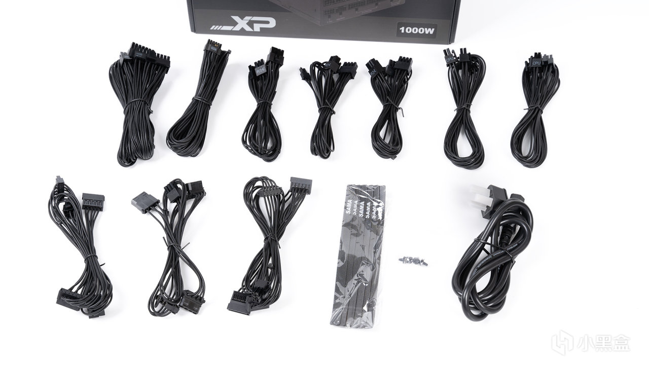 模組線和相關配件,配備螺絲之餘還有提供魔術紮帶,全套模組線都是採用壓紋線更方便的設定,包括1*24pin供電、2*(4+4)pin CPU供電、1*16pin PCIe 5.0 12VHPWR供電、3*(6+2)pin PCIe供電、2*SATA以及1*大4pin這些類型,可以滿足高端配置需求。