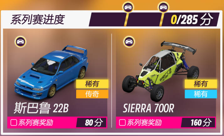 S45賽季系列賽80分進度獎勵爲1998款斯巴魯 IMPREZA 22B-STI VERSION和160分進度獎勵爲2021款SIERRA CARS 700R