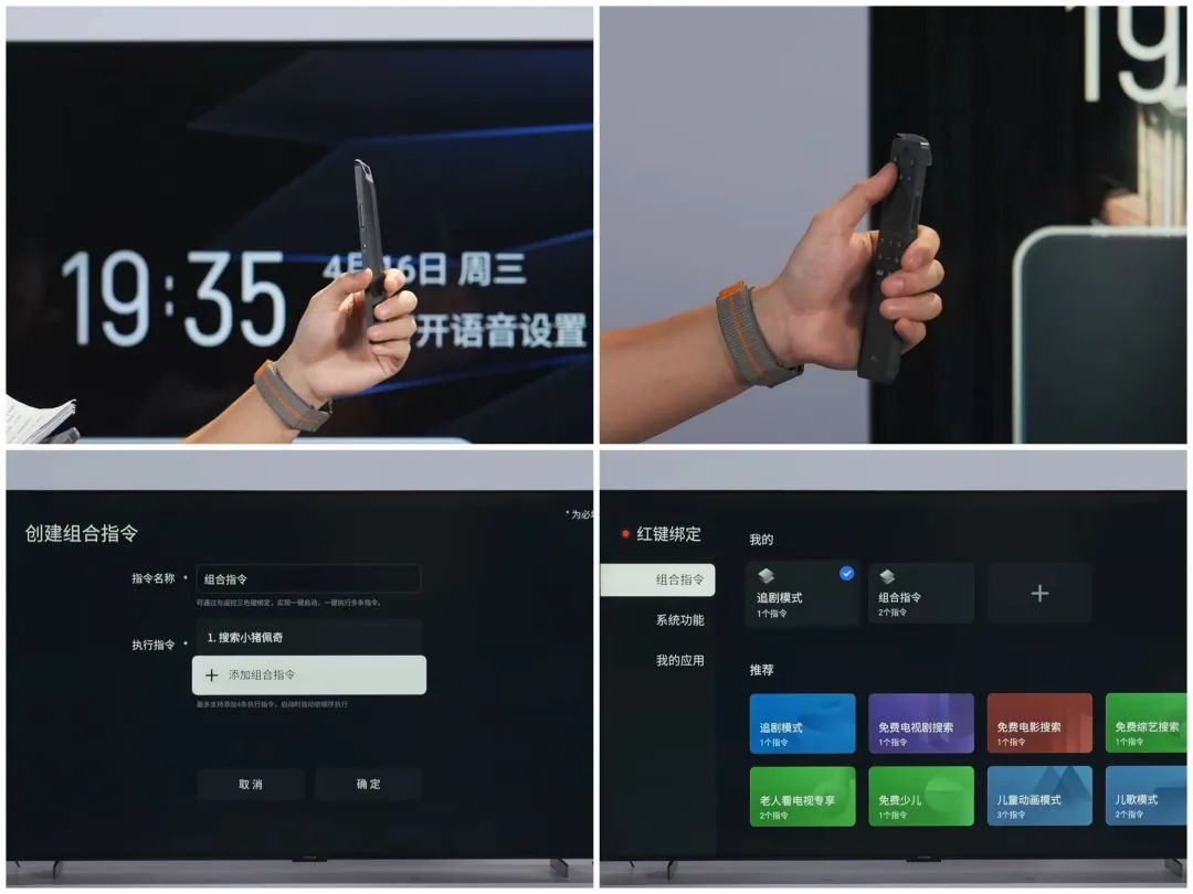而且可設計組合指令,除了添加某一功能或APP外,甚至還可深入到特定的影視內容,追劇更便捷,遙控器還支持遠場語音控制,側鍵能直接調節亮度、切換場景模式。