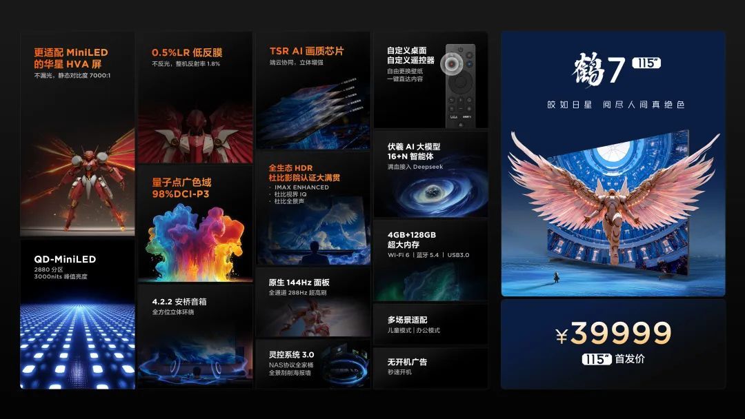 除了前面介紹的幾款產品外,直播中還提到了一款重量級的新品——搭載115英寸巨幕的鶴7 25款,首發價是39999元,也是雷鳥品牌誕生以來配置最高的一款產品。