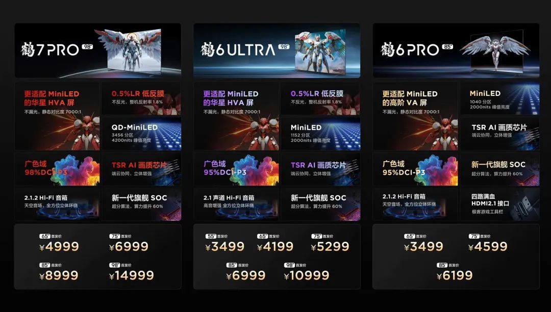 除了鶴7 Pro 25款外,直播中也有提到其他幾款不同型號的產品,比如同樣具備98英寸規格的鶴6Ultra(首發價10999元,國補後8999元可入手)以及最大可選85英寸的鶴6 Pro 25款(首發價6199元,國補後4959元可入手)。