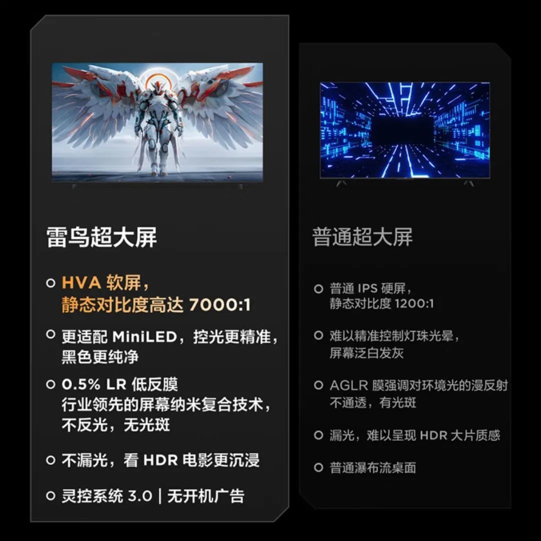 雷鳥近期發佈的新產品參數、價格都很亮眼,在硬件層面,比較值得關注的兩個地方是華星HVA屏和LR低反膜。