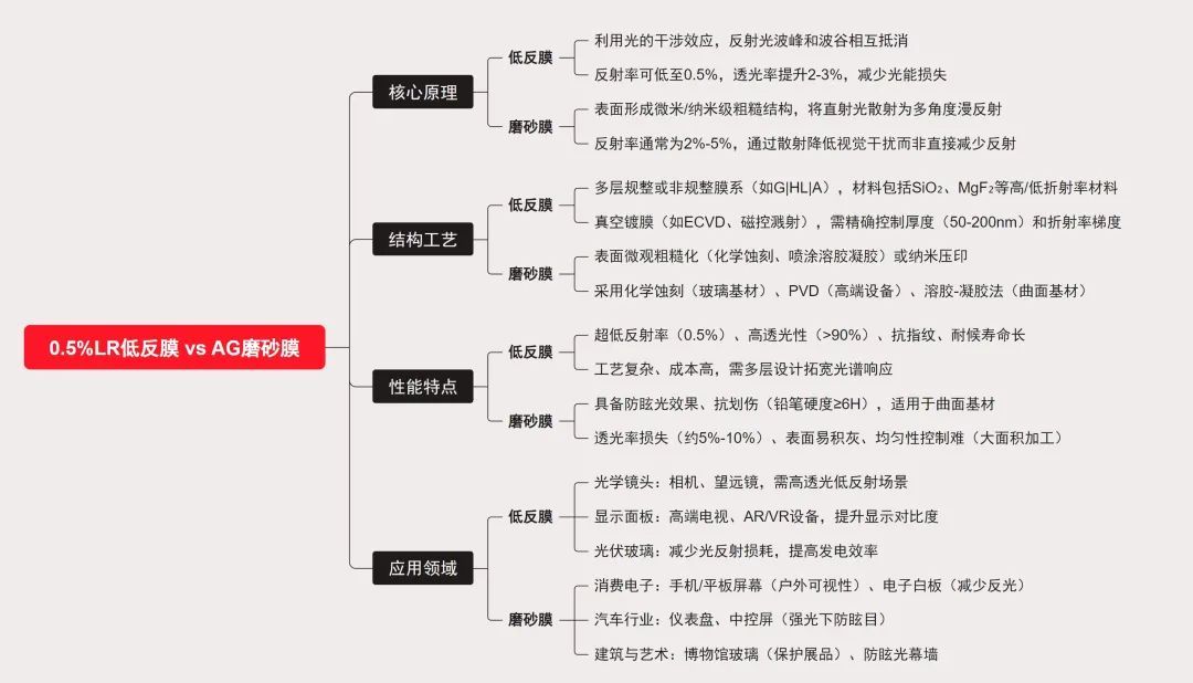 現在市面上很多電視抗反光搭載的都是AG磨砂膜,其特點是工藝簡單、成本低,但對比0.5%LR低反膜,還是有非常大的差距,二者的主要區別有以下幾點。