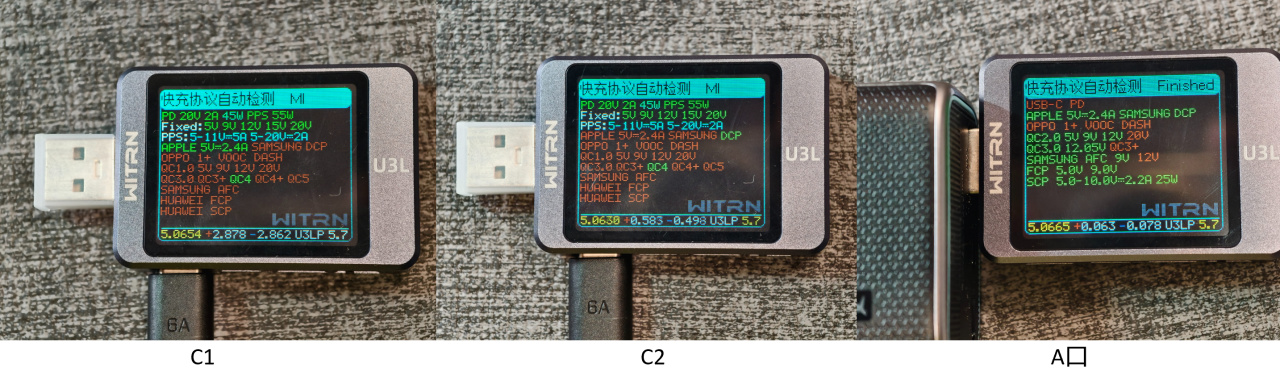 採用維簡U3L進行協議檢測,其C1/C2兩口主要協議基本一致,都支持PD最大45W(支持20V檔位),PPS最大55W輸出,其C1口額外支持Apple 2.4A,C2口則額外支持三星DCP(現在三星基本上也走PD協議)。