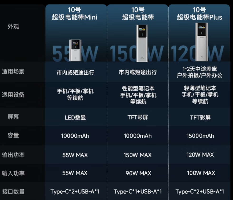 10號PLUS:國補價194元,由於採用三顆21700電芯(內部有空位),10號Plus的體積控制個人並不滿意,但15000mAh的容量和三接口設計,填補15號與10號間的生態空缺。挺適合中途出差,在一天內無法爲設備補能的用戶,100W的自充也很快,算是容量/充放電效率/重量兼得的產品。