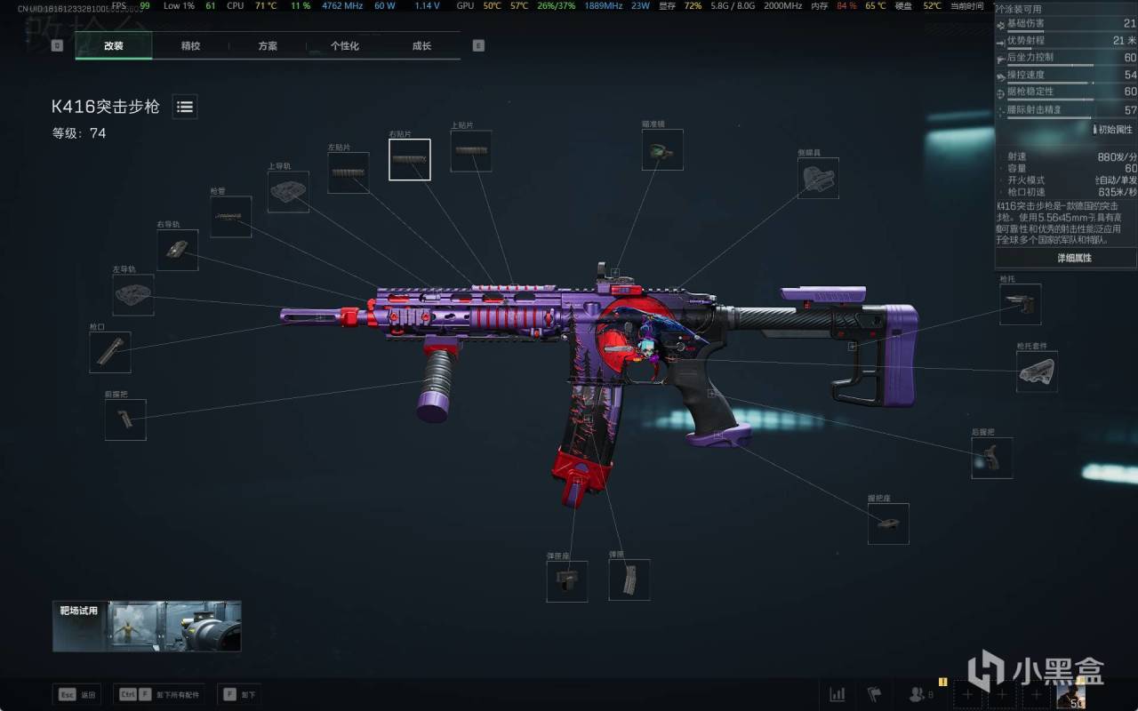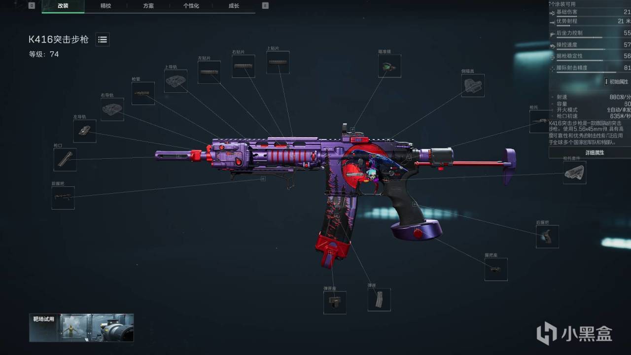 圖中最亮眼的數值就是880發的射速,這意味着K416在近距離交戰中難逢敵手,不過射速這麼高要試一下槍看一下槍身抖不抖再決定選裝的配件。