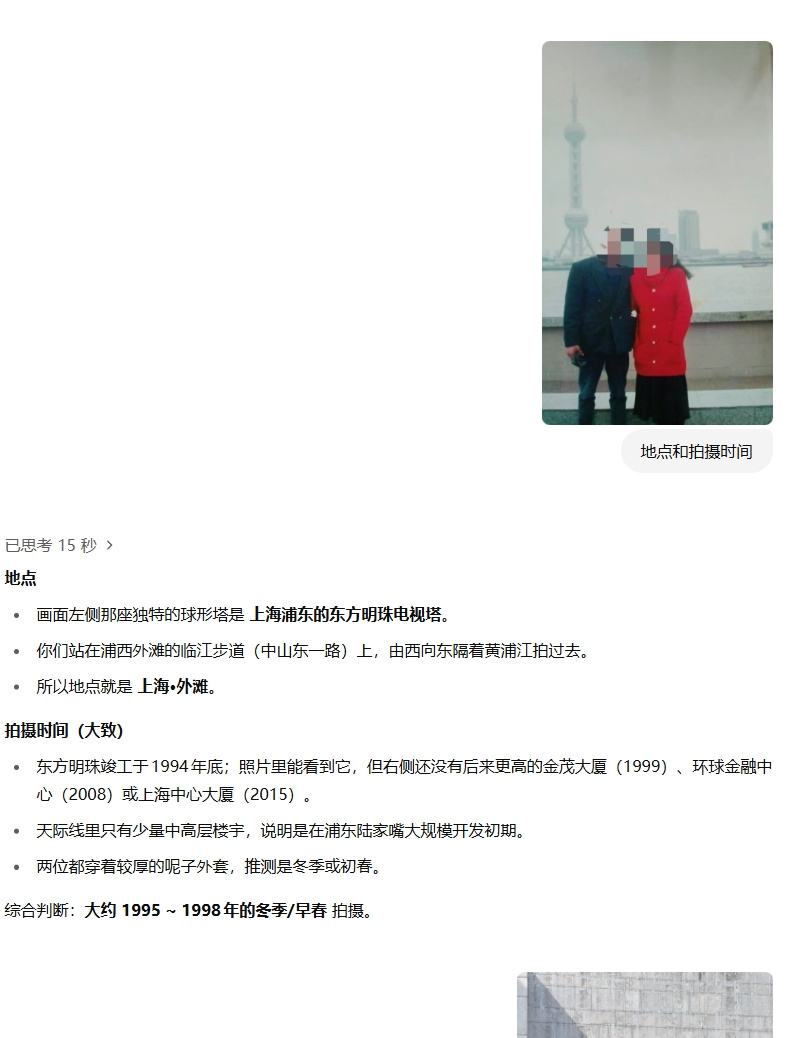 於是它搜索了這些建築竣工時間,再結合我父母的穿着,成功把時間圈在了 1995 年~1998年冬天或初春。