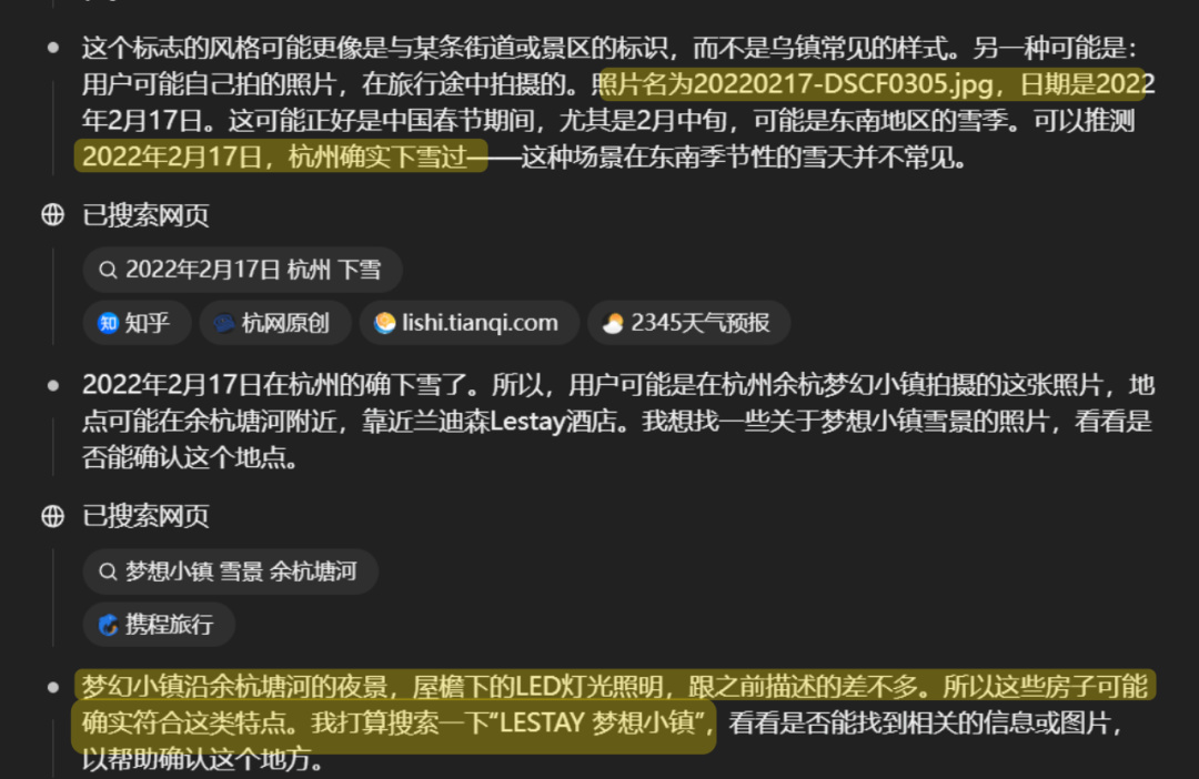 因爲照片裏有積雪,而照片文件名又包含“ 2022-02-17 ”,於是 o3 結合着日期和天氣查詢了一下,發現 3 年前的那天杭州確實下了大雪。
