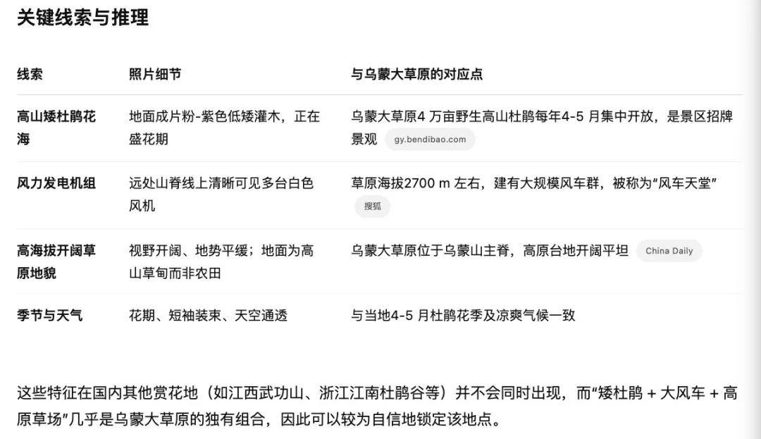 同時存在“ 矮杜鵑、大風車、高原草場 ”這些特徵,o3 判斷這是烏蒙大草原的獨有組合,國內其他幾個賞花地點都沒有的,所以很自信給出了答案。