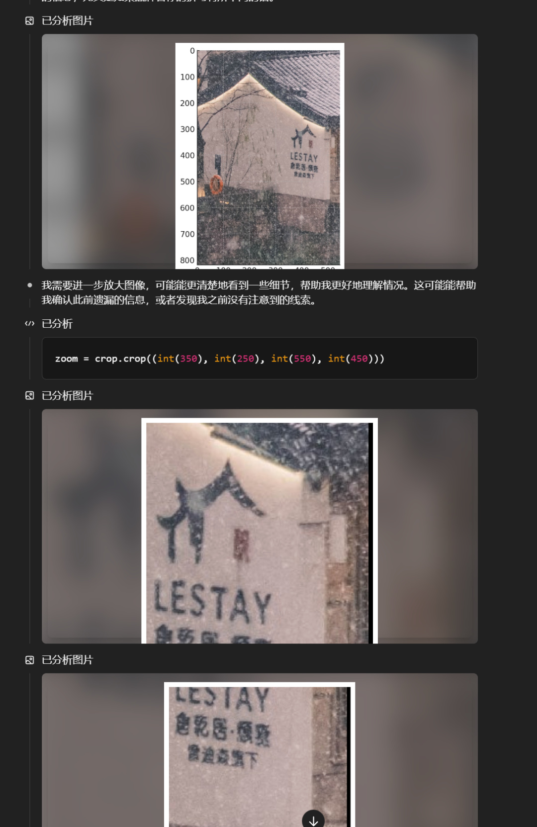 照片中有一處招牌,o3 不斷放大發現了文字“ lestay 倉乾居 ”
