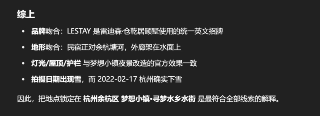 至此,招牌、地形、建築風格、拍攝日的天氣全部吻合, 最終 o3 推導完畢,把地點鎖定在了餘杭區夢想小鎮。