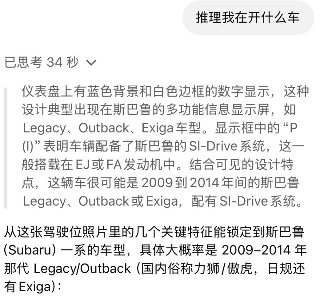 很快噢,o3 一眼判斷出這種典型設計是出現在斯巴魯上,它甚至還告訴你,這款車型國內通俗稱爲力獅/傲虎,這輛車還配備了 SI-Drive系統。